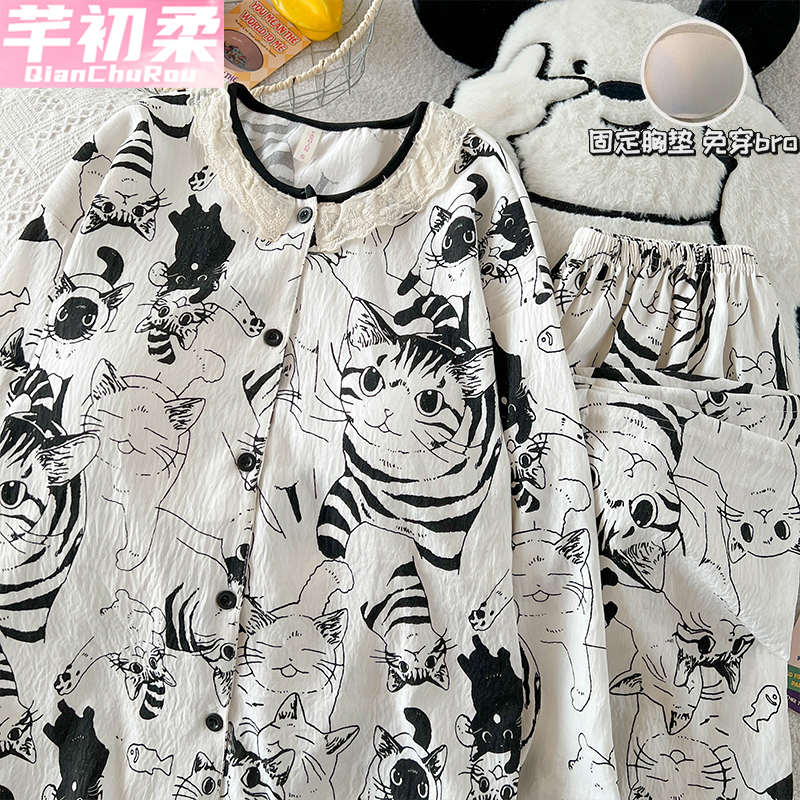 纯棉长袖 家居服套装 春秋款 夏2025年新款 冬 全棉秋冬开衫 睡衣女秋季