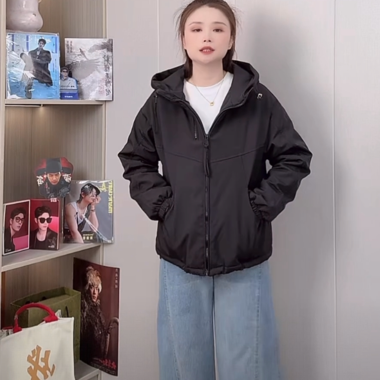 宽松小个子洋气夹棉棉服 新款 中戏短款 黑色情侣棉衣外套潮2025冬季