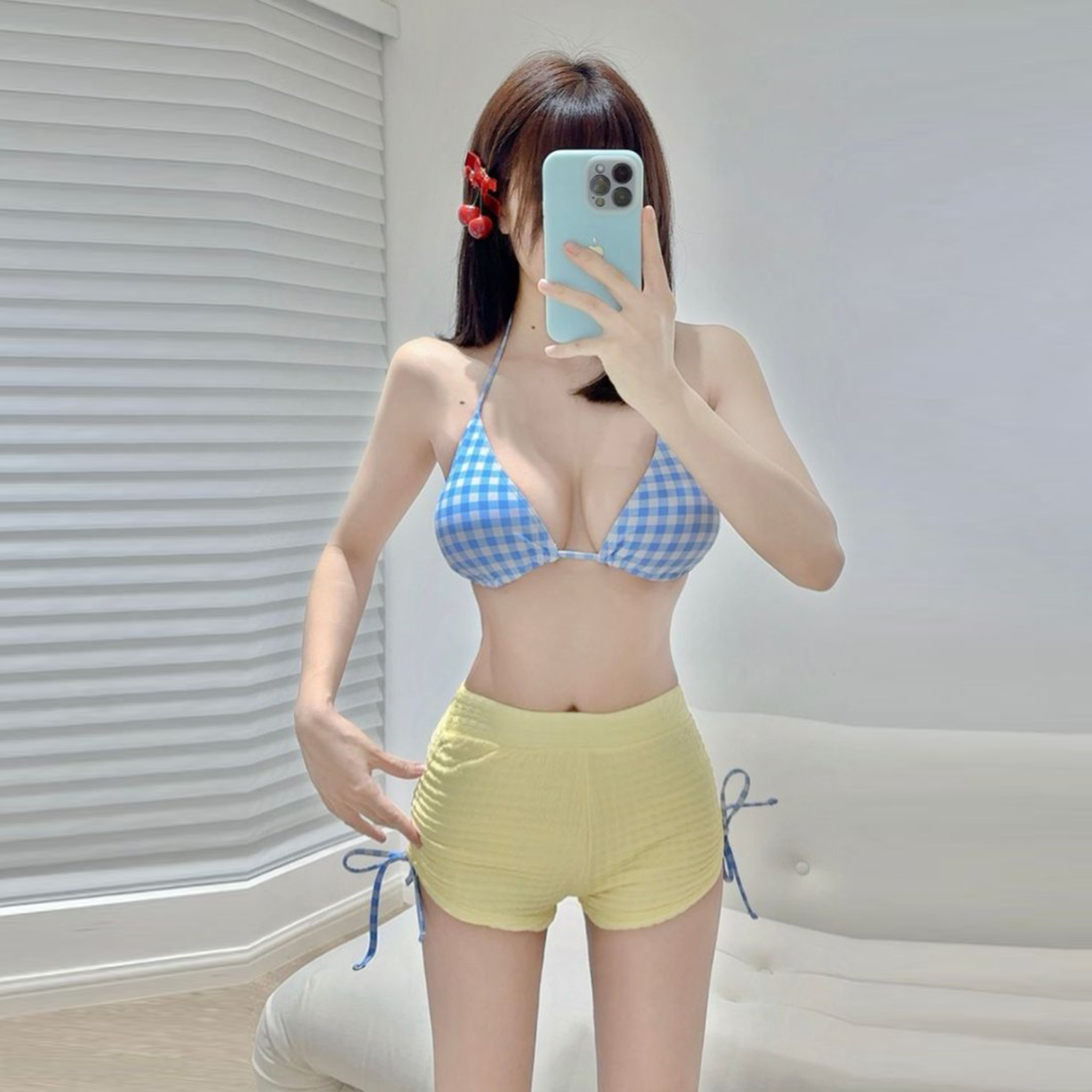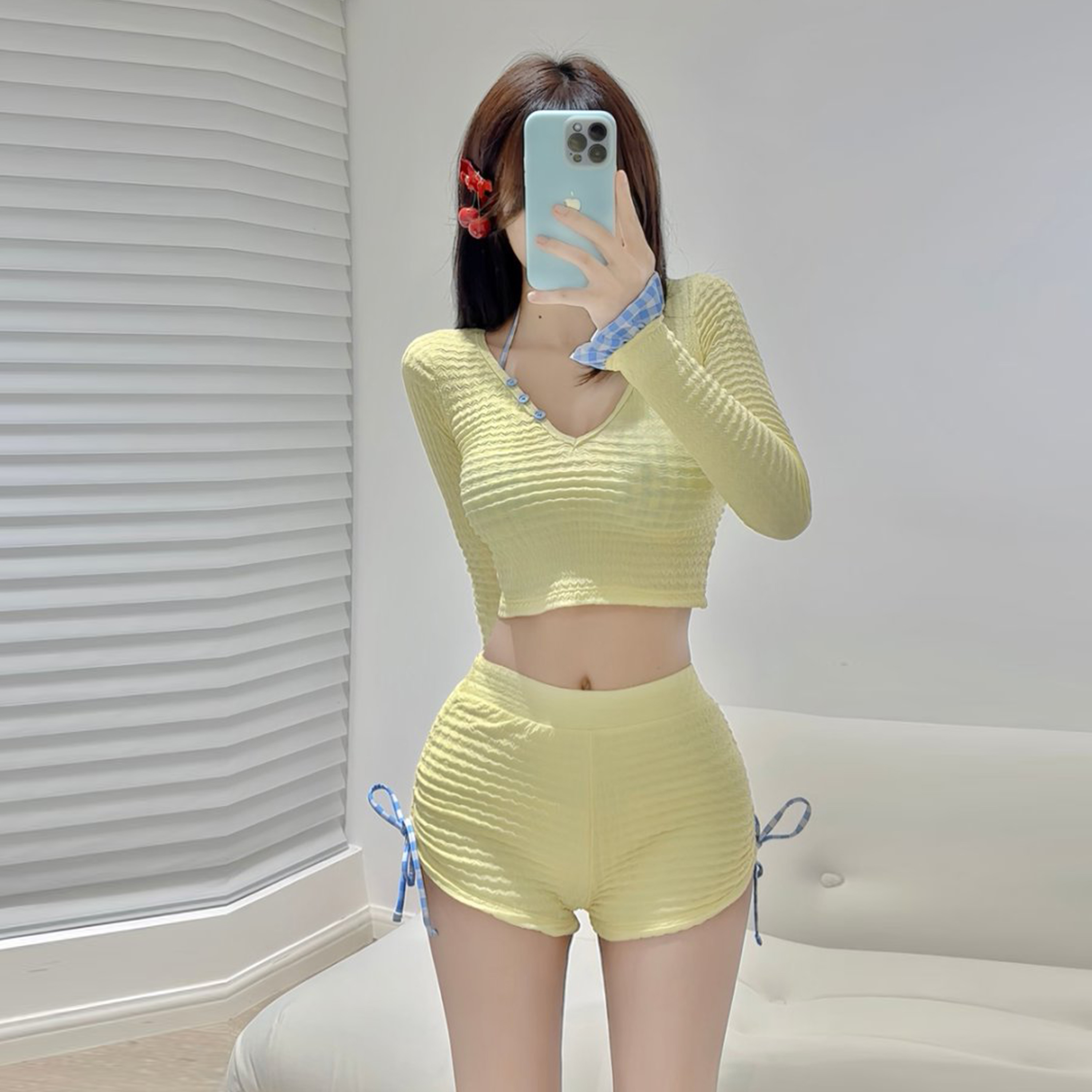 黄色蓝格樱桃少女分体长袖 保守辣妹度假风比基尼四件套温泉泳衣女