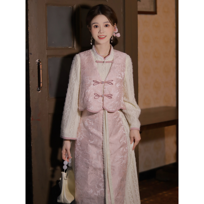 裙子三件套 粉色长裙马甲暗纹浮雕提花汉服新中式 瑶西 粉黛书意