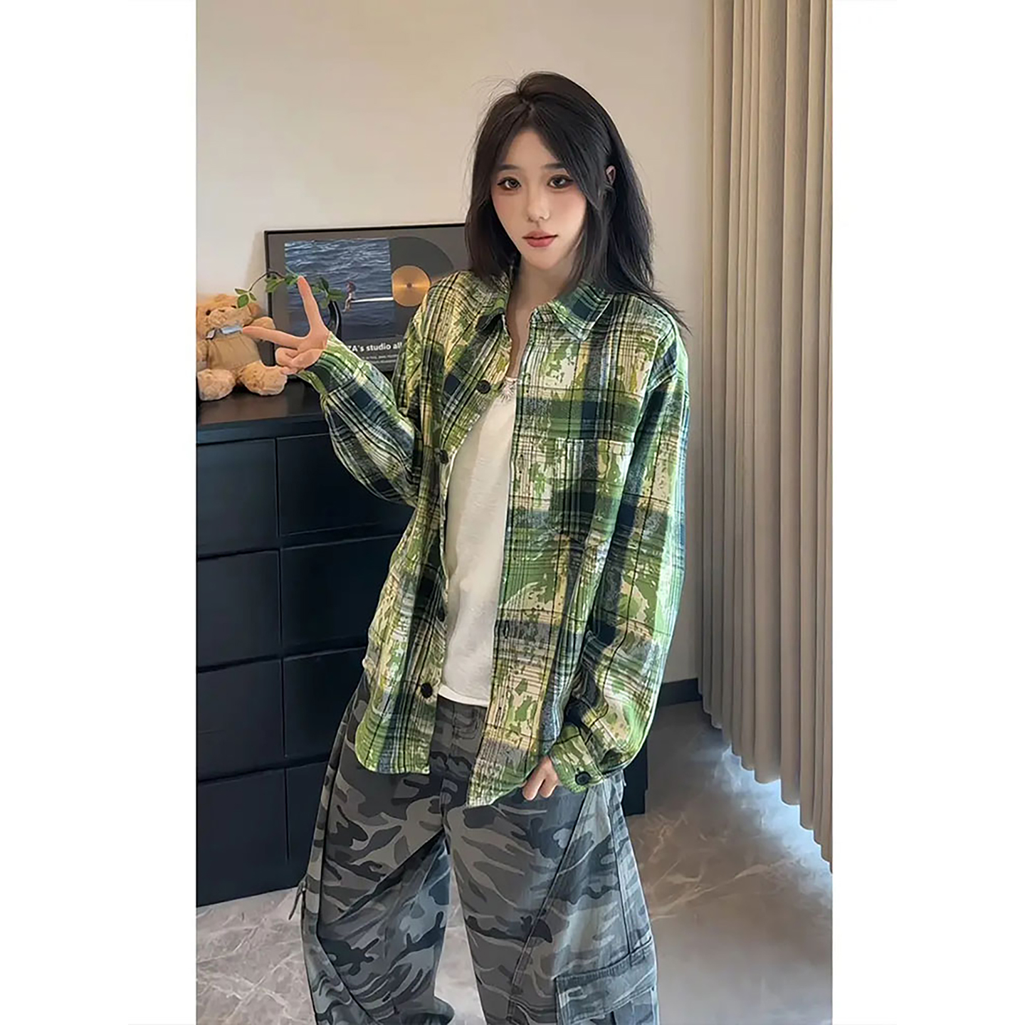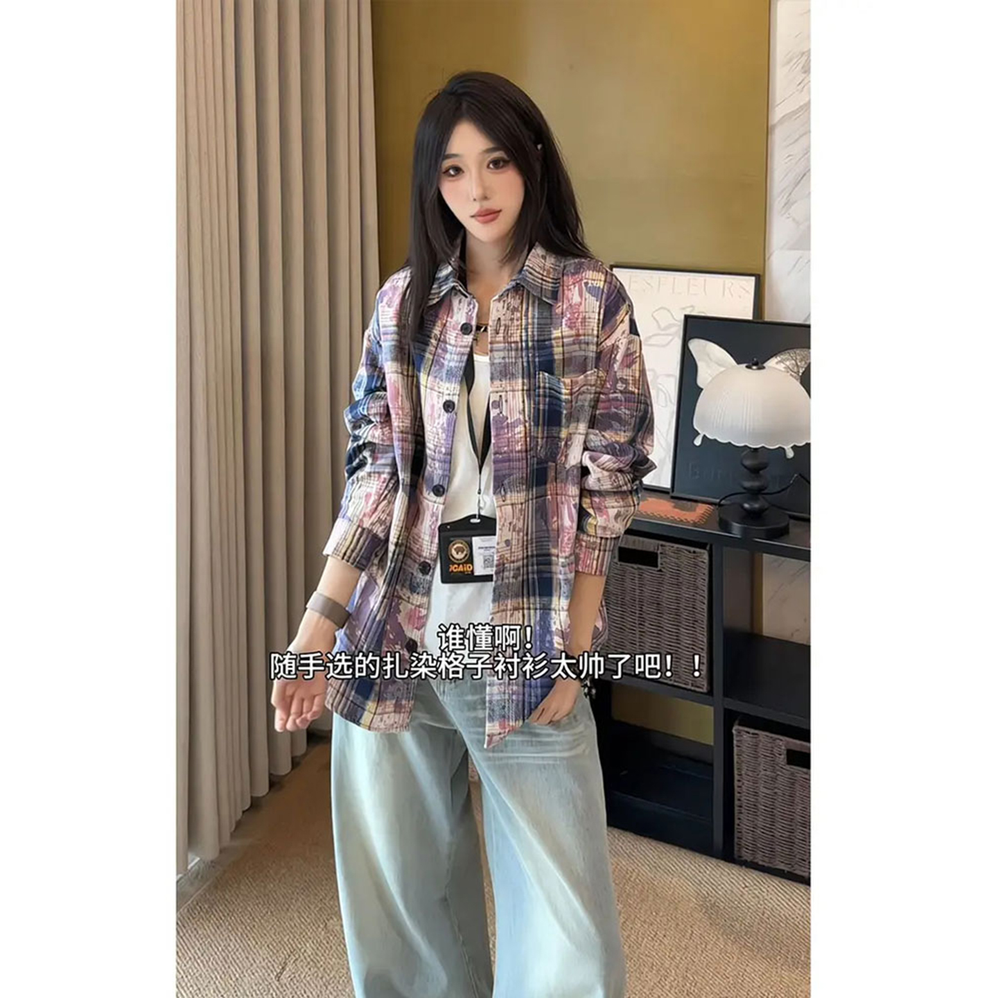 复古水墨晕染衬衣翻领开衫 蓝色扎染格子衬衫 美式 秋季 情侣外套 男款