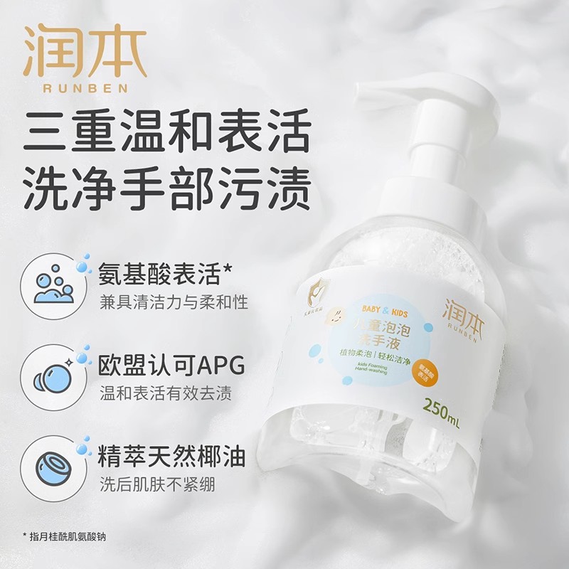 润本儿童洗手液婴幼儿宝宝专用泡沫型温和清洁植物护手家用按压瓶
