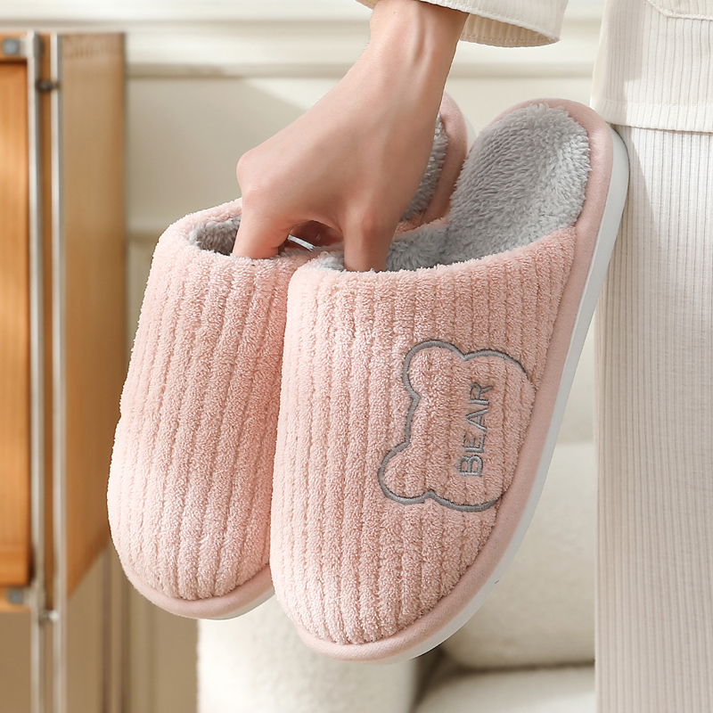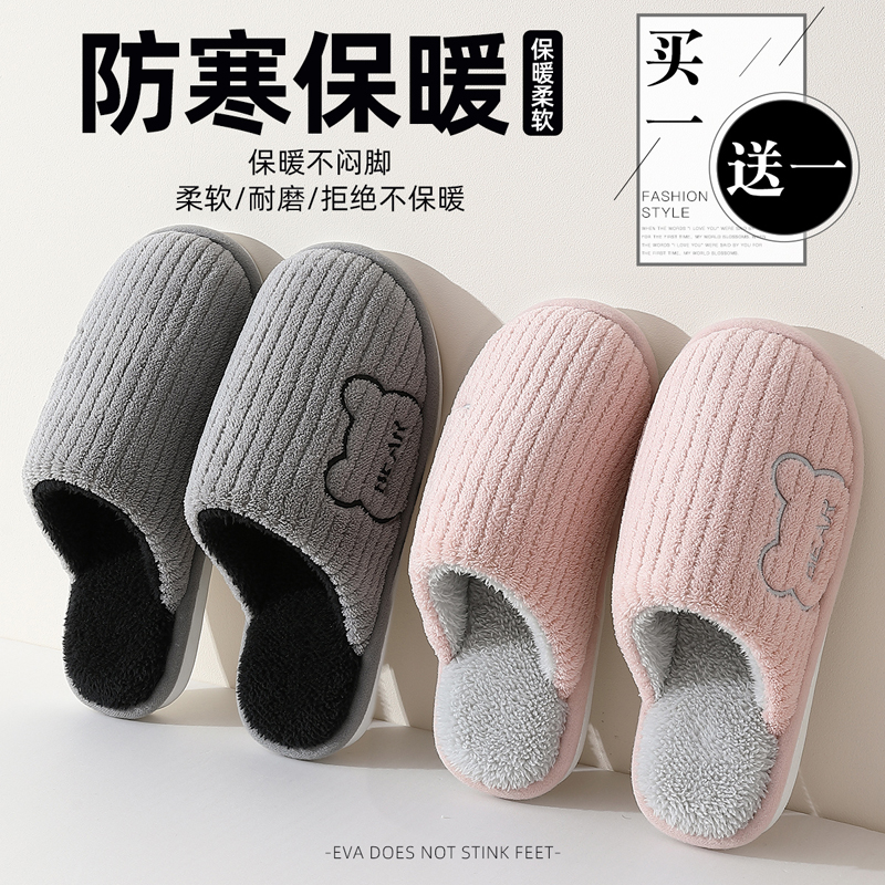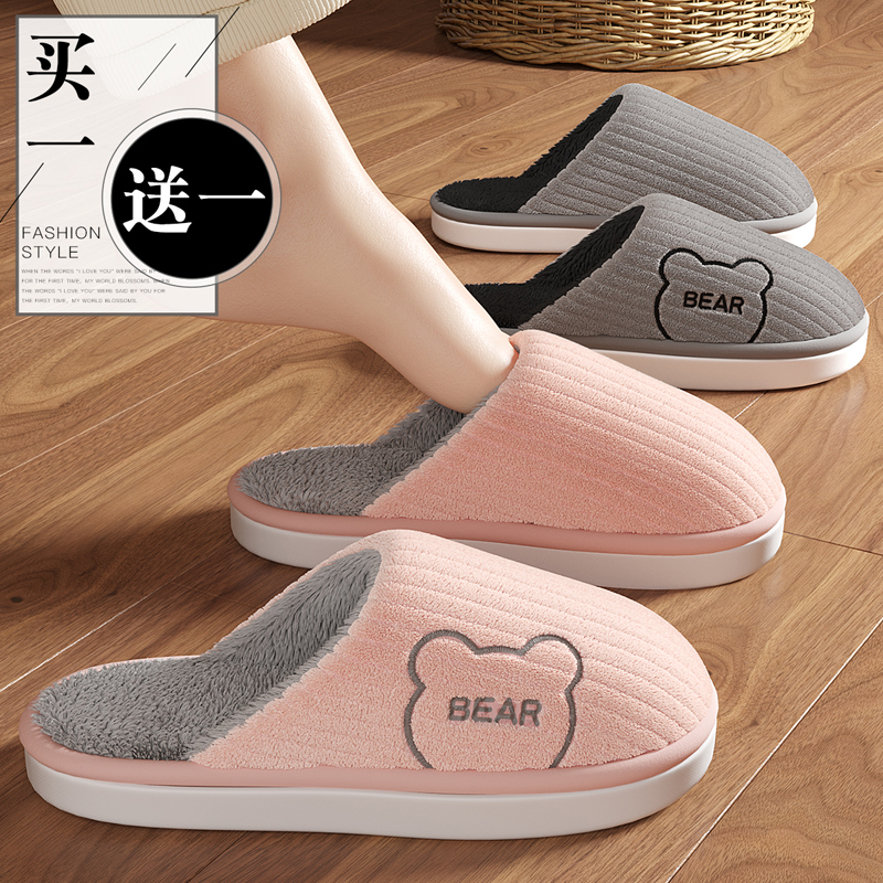 男 情侣地板防滑家居室内软底加绒毛拖鞋 买一送一棉拖鞋 女士秋冬季