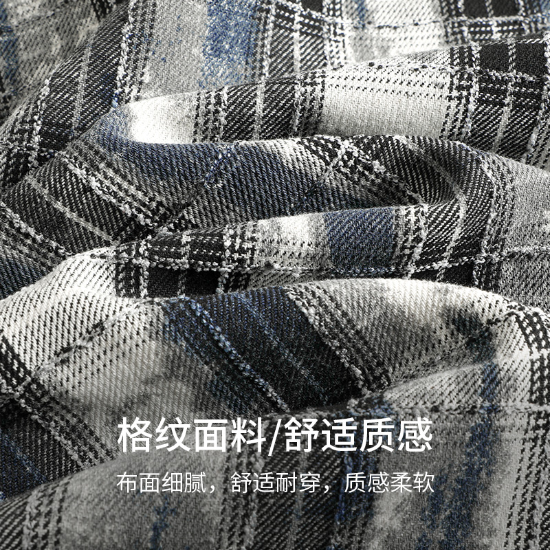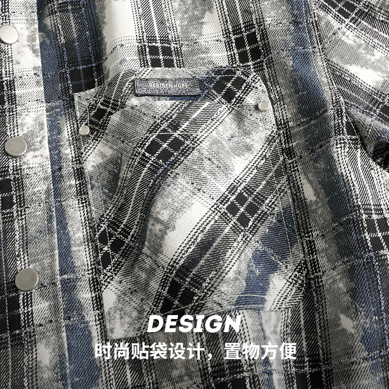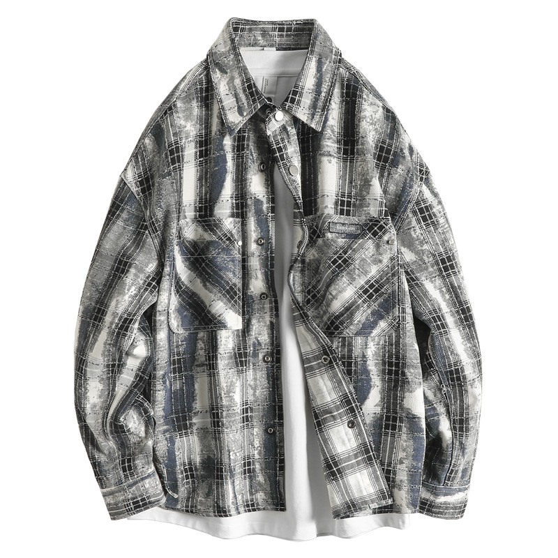 男 休闲微宽松撞色衬衫 潮牌扎染涂鸦设计格子衬衣男长袖 外套秋冬季