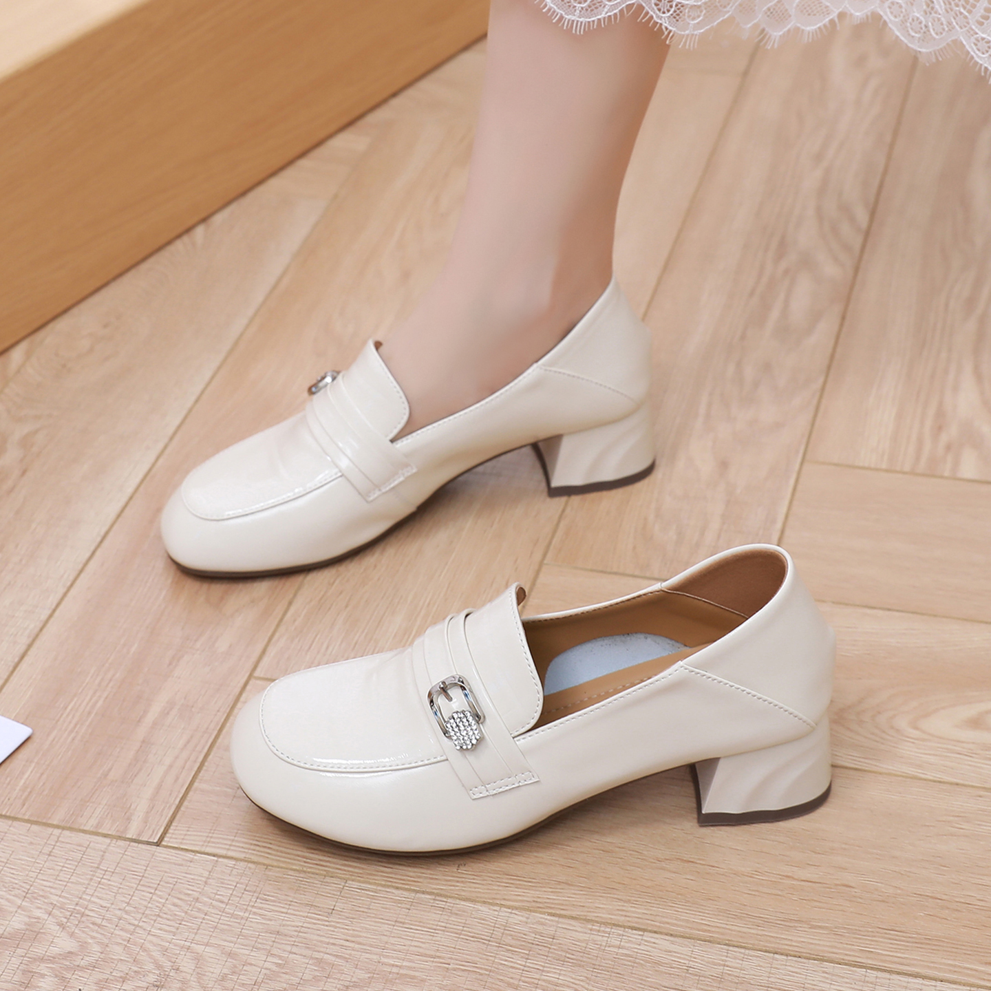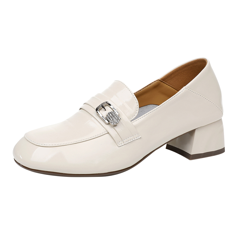 通勤女鞋 真皮粗跟漆皮乐福鞋 气质中跟单鞋 大码 女软底不累脚妈妈鞋