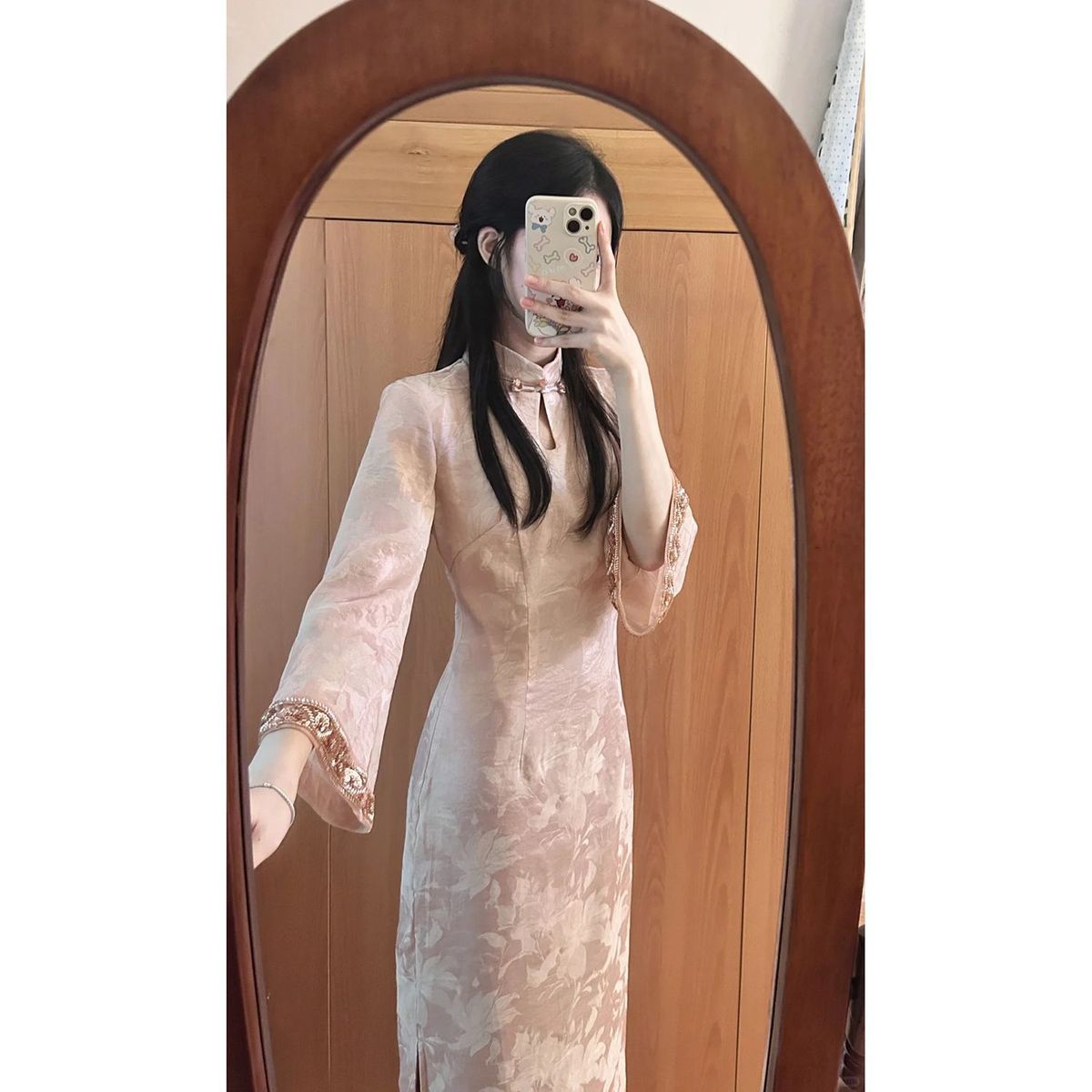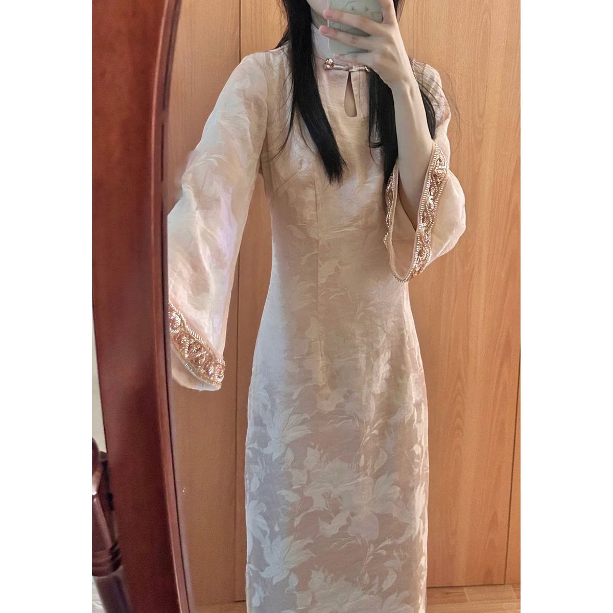 菲梦伊原创钉珠提花连衣裙女秋季 国风高端气质贵妇旗袍裙子 新中式