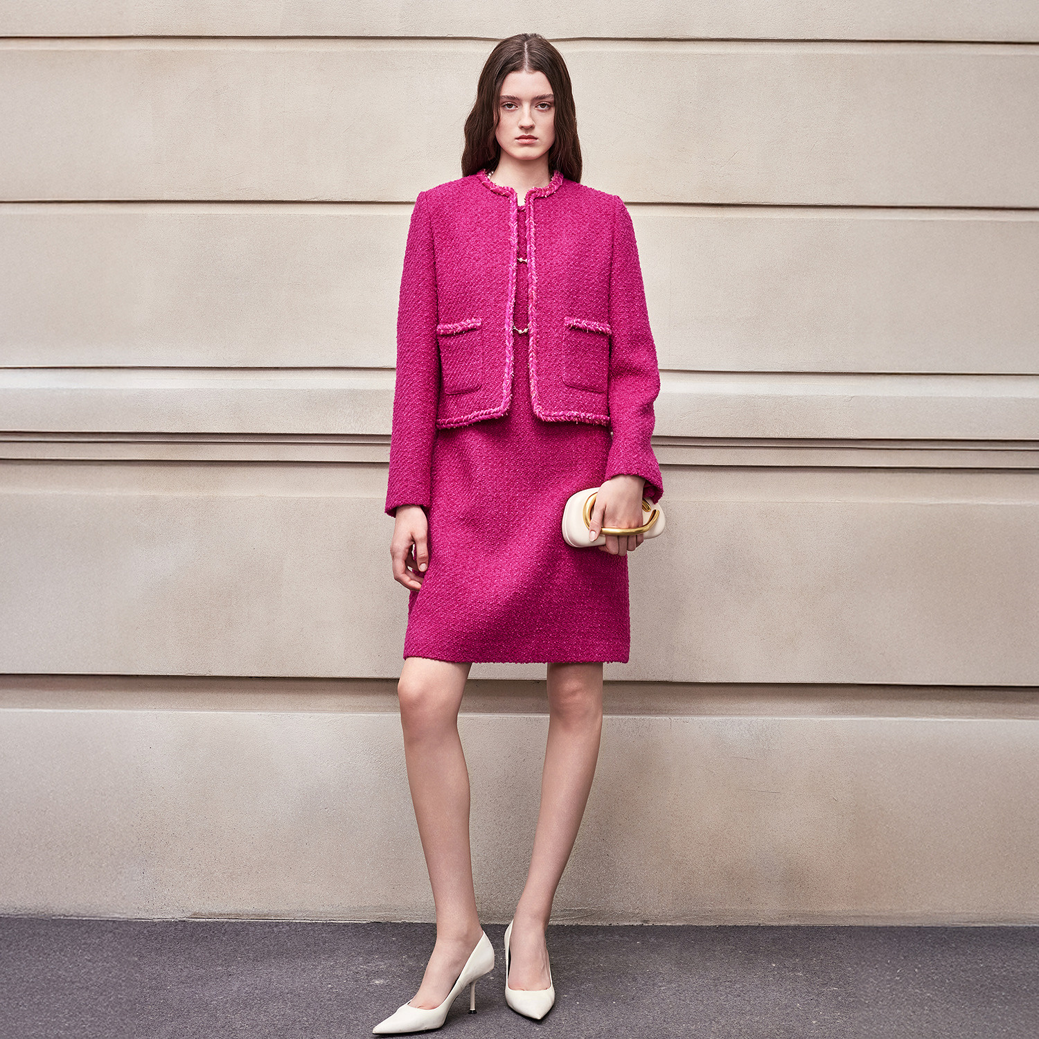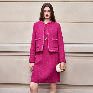 BCBG25早秋新款 外套女 日常通勤织带饰边圆领小香风粗花呢短款
