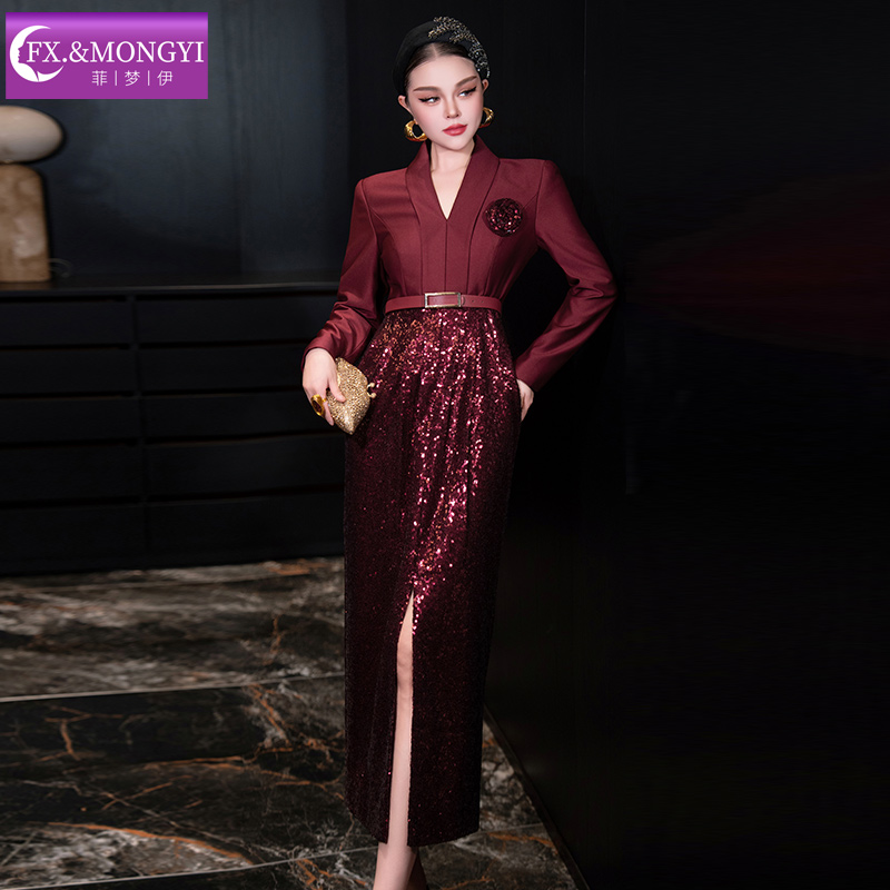 菲梦伊原创亮片红色西装 本命年高级感气质开叉礼服裙 连衣裙女秋季