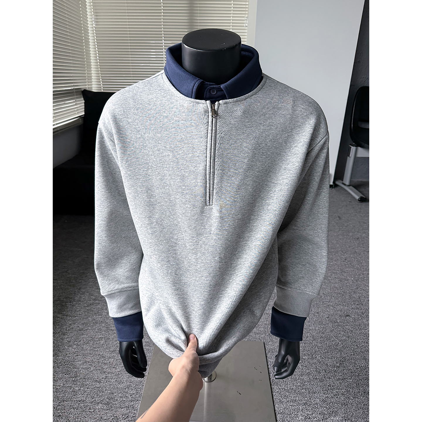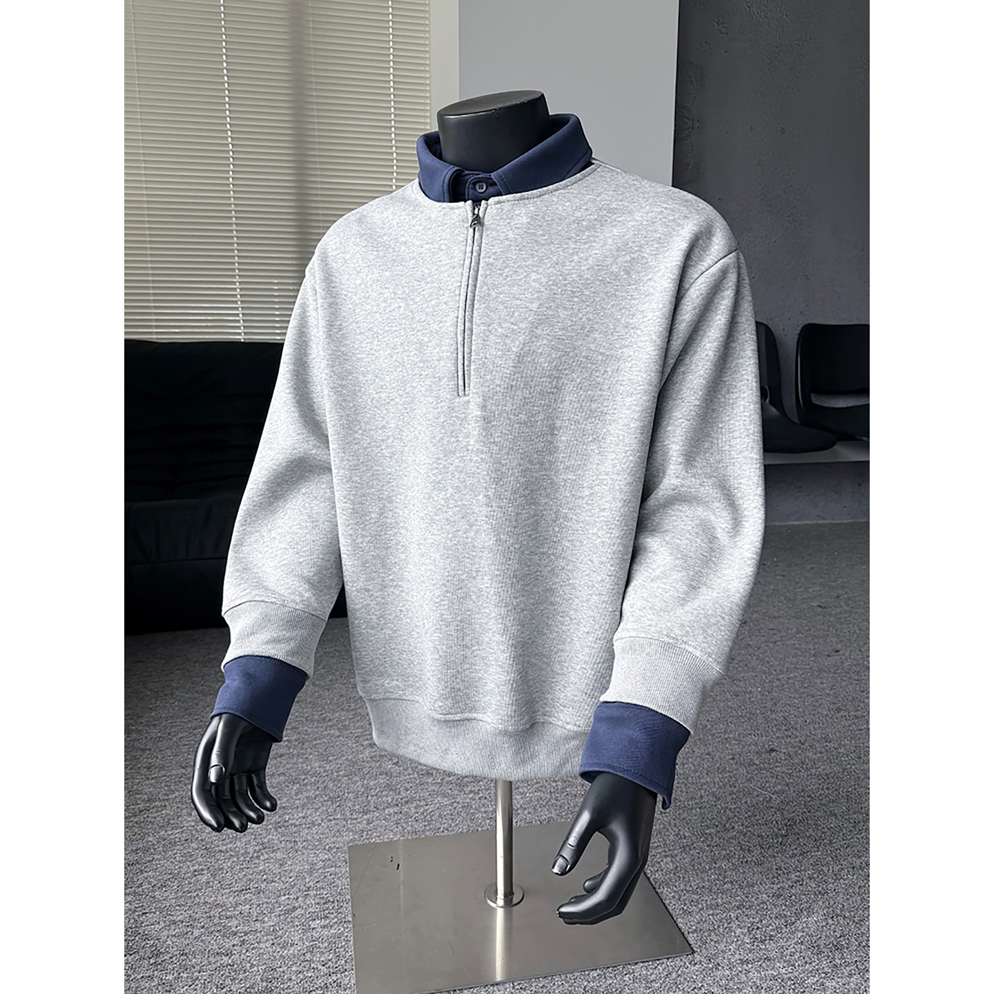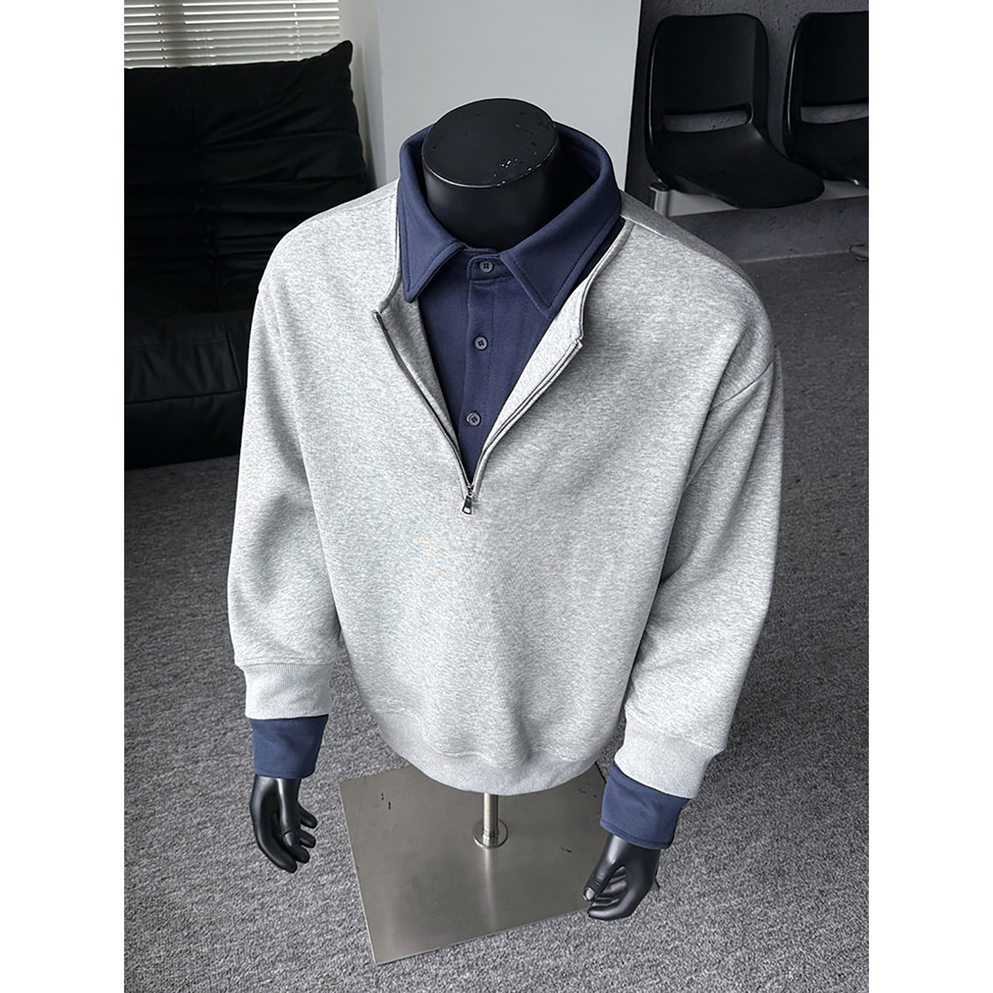外套 设计感polo领卫衣cleanfit情侣长袖 灰色假两件半拉链衬衫 男式