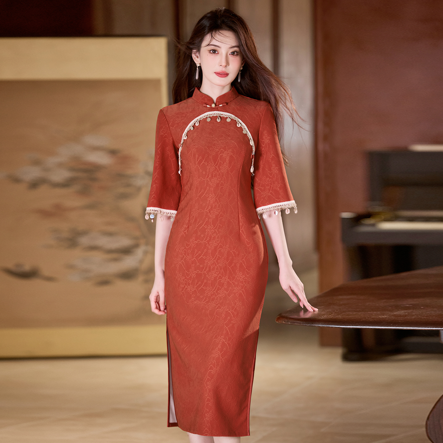 婚礼婆婆旗袍复古长款 旗袍 酒红色醋酸缎提花传统婚礼妈妈婚宴秋季