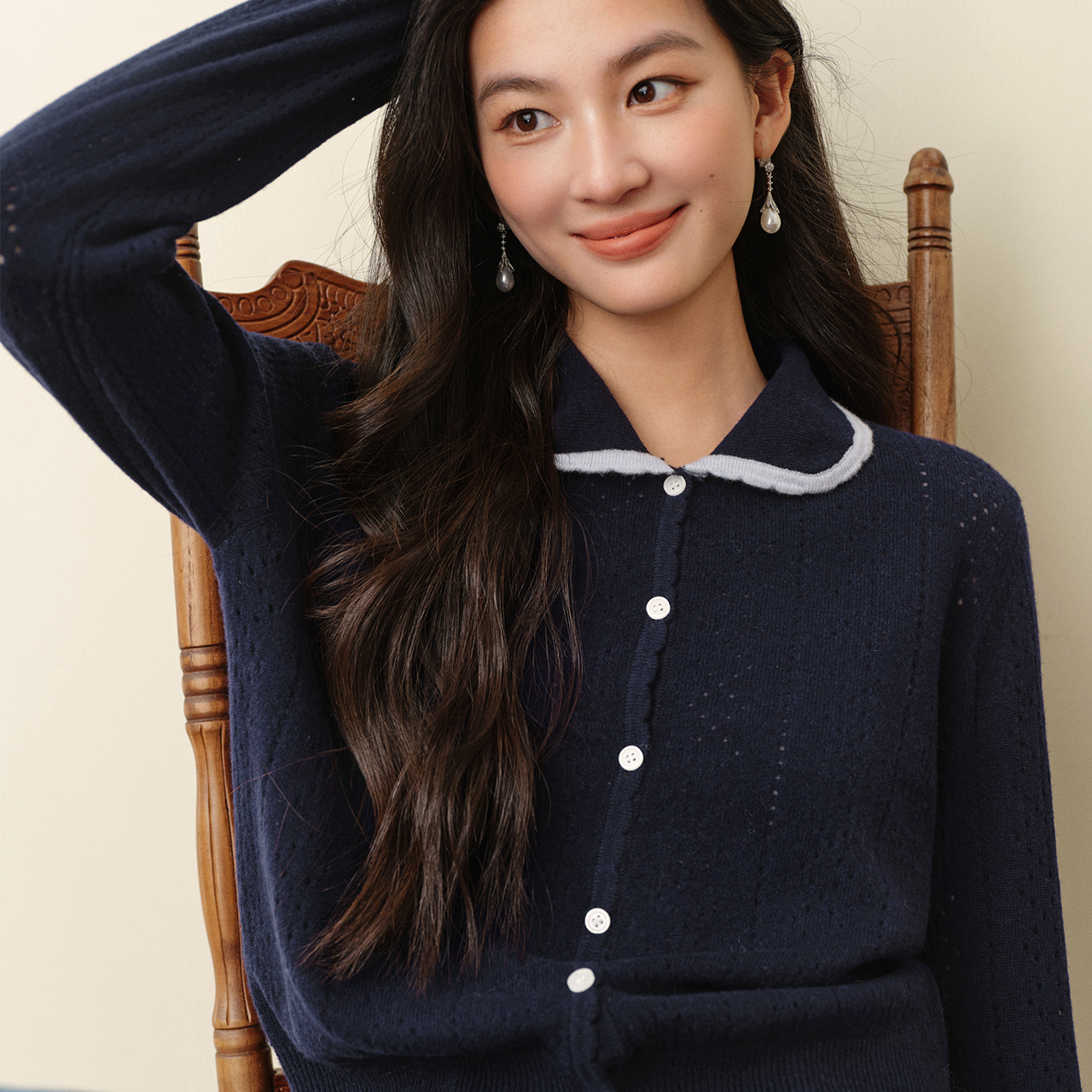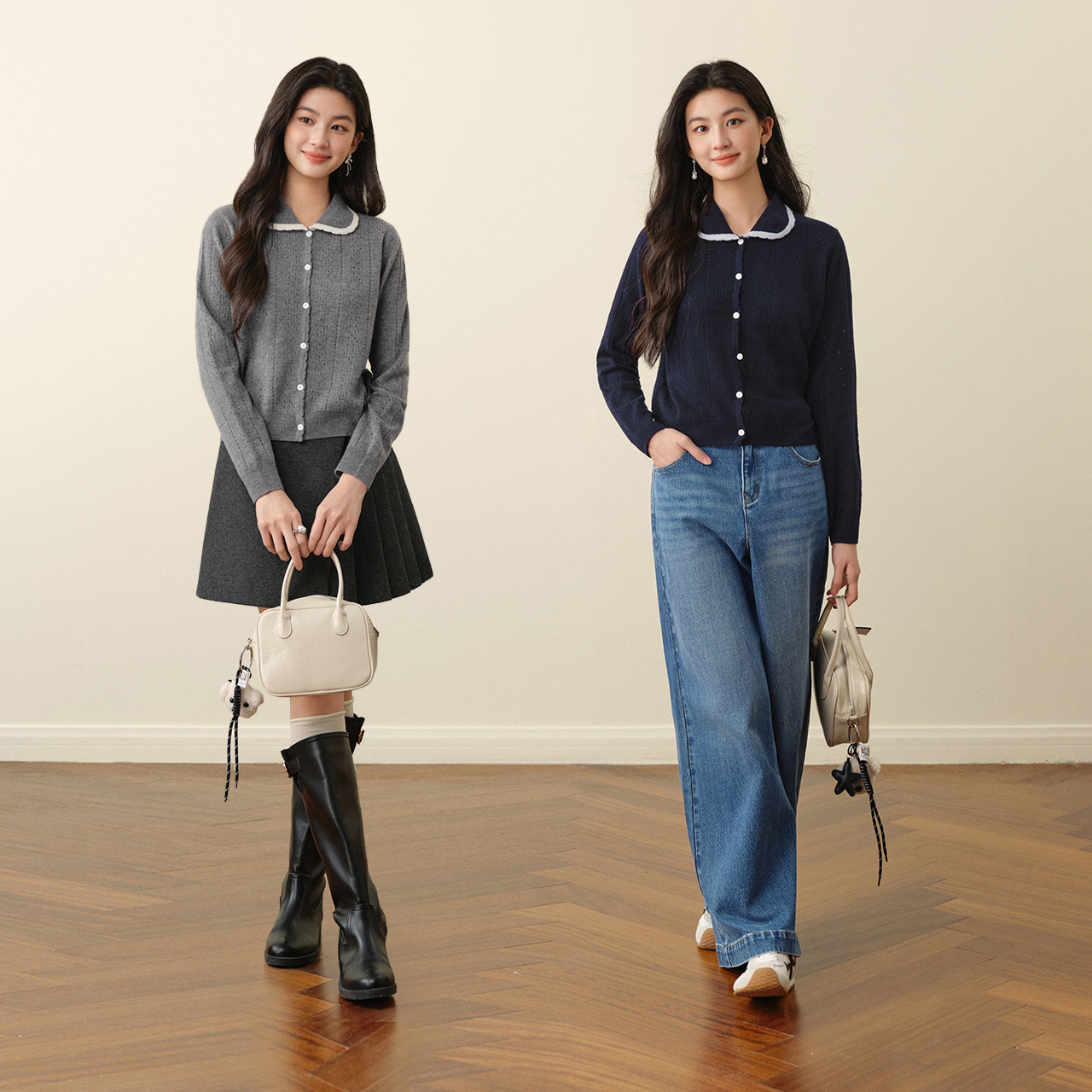 上衣 镂空软糯显瘦长袖 诗凡黎全羊毛花边娃娃领针织开衫 2025冬新款