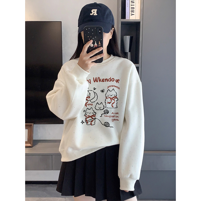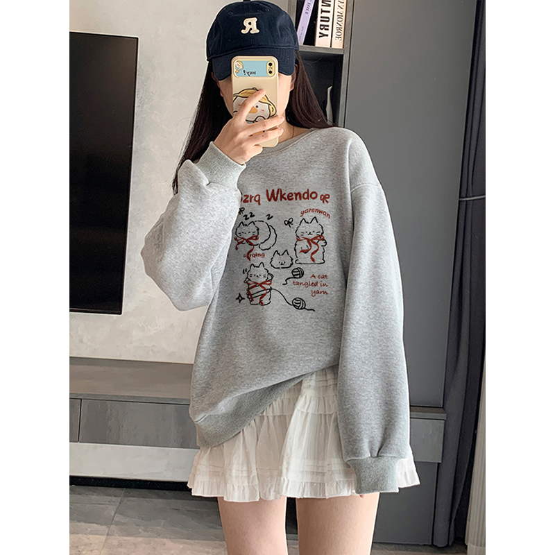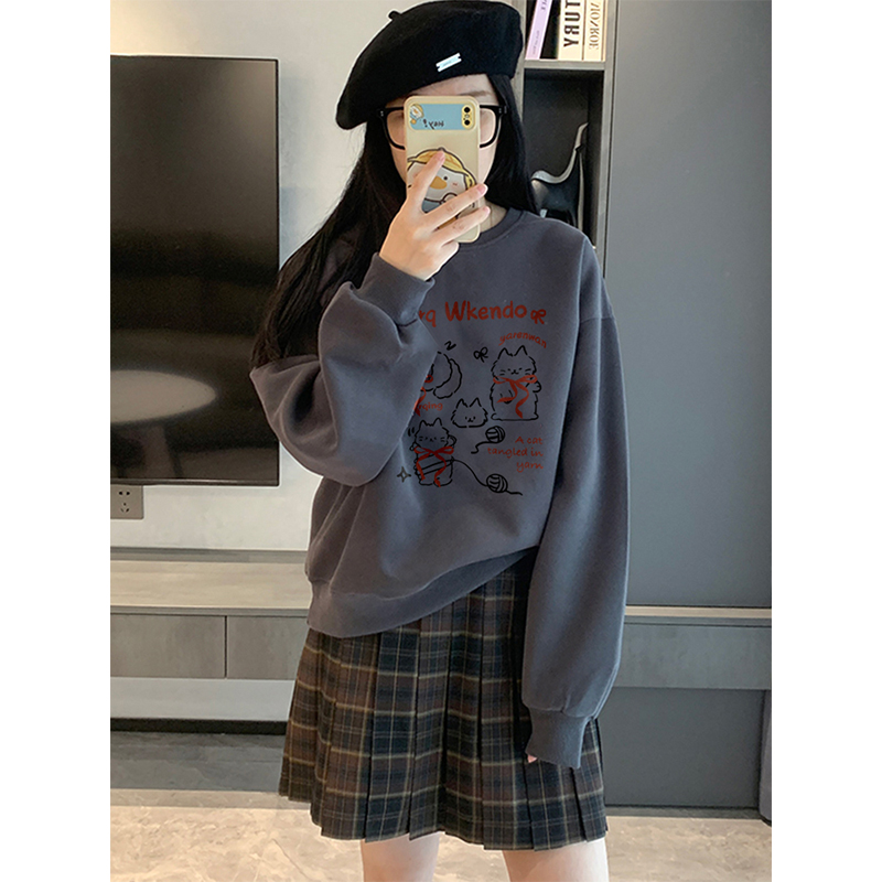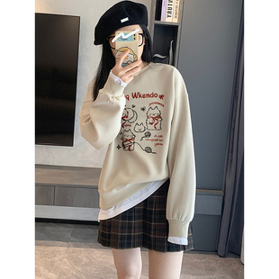 美式 小众设计感印花上衣潮 卡通可爱风圆领卫衣女胖mm宽松显瘦大码