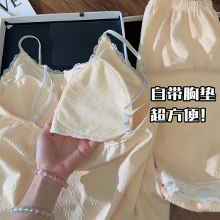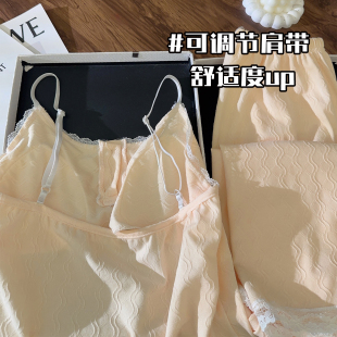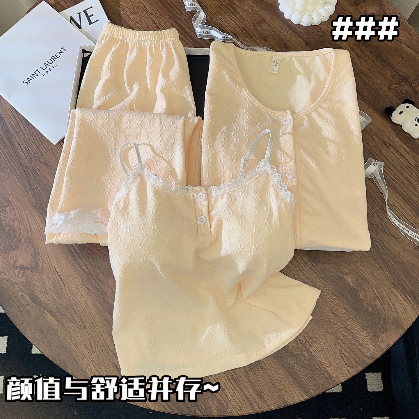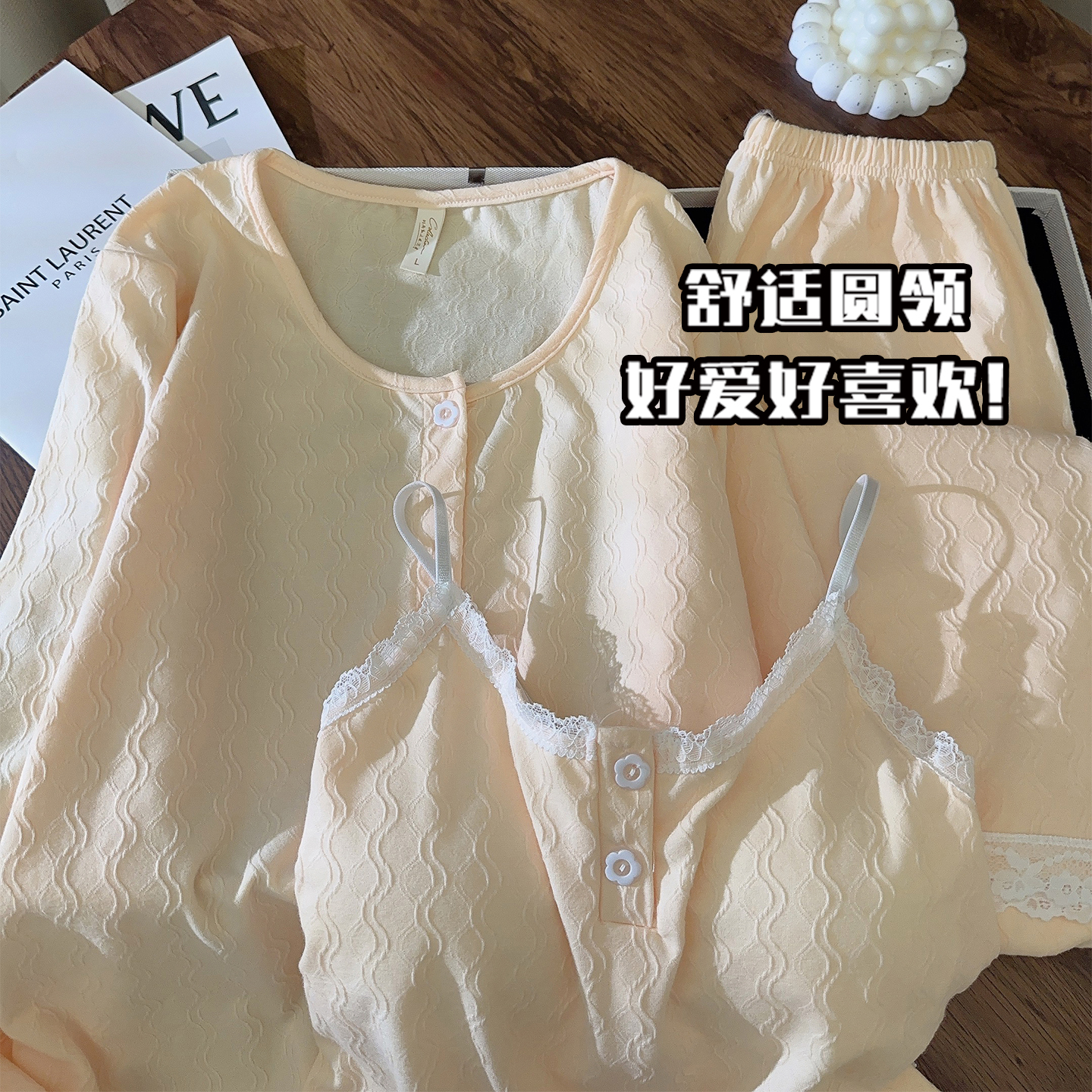 高颜值网红风家居服冬天 纯棉薄款 奶呼呼睡衣女春秋季 吊带三件套装