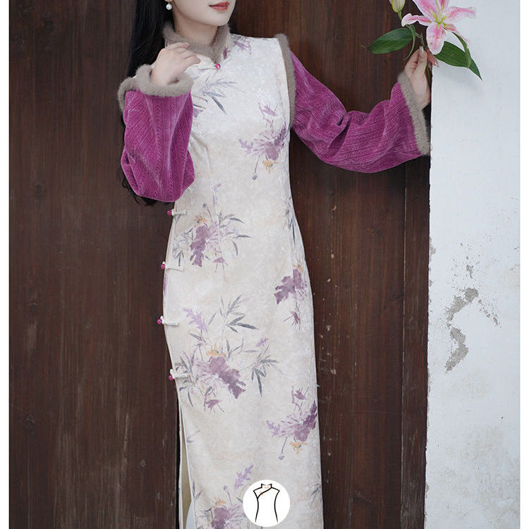 改良旗袍长款 新中式 国风V领长袖 新款 裙子 粉色连衣裙女2025年秋季