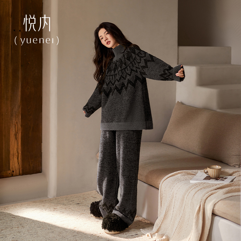 雪花绒锁温保暖可外穿宽松睡衣家居服秋冬天加绒加厚女法兰绒套装