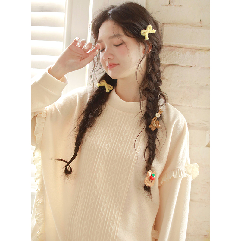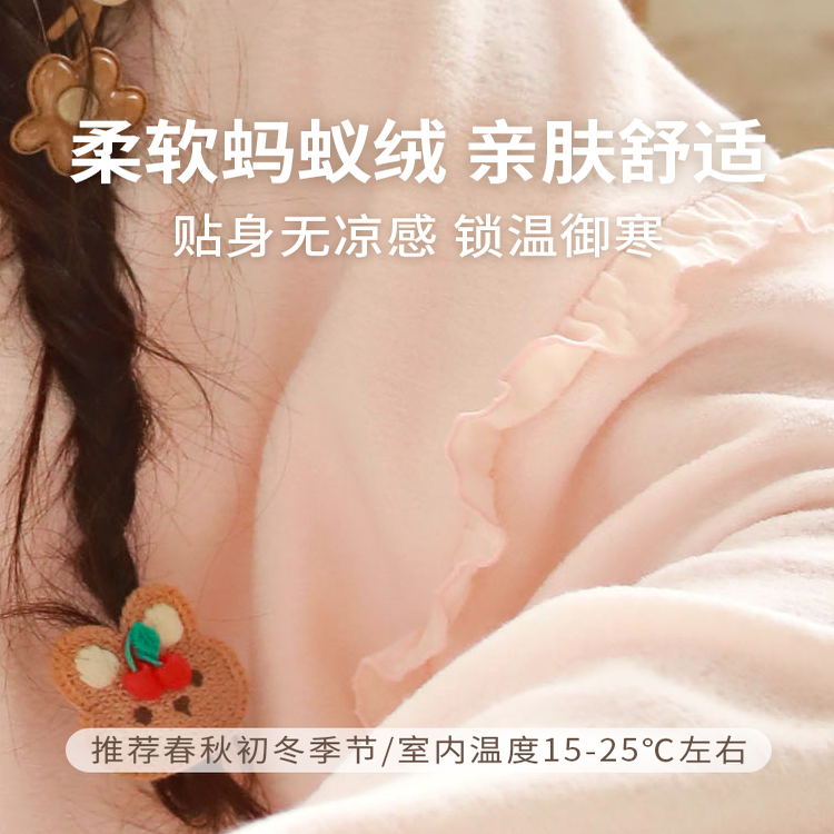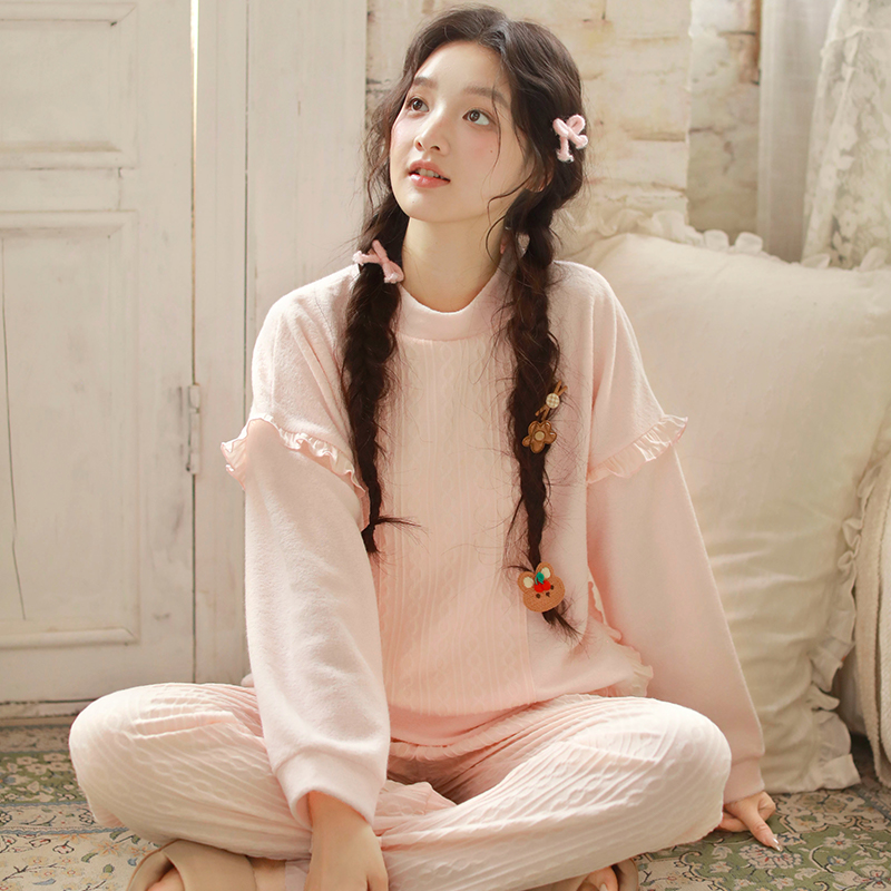 可外穿女 睡衣家居服套装 春秋季 针织保暖可爱甜美蕾丝花边圆领长袖
