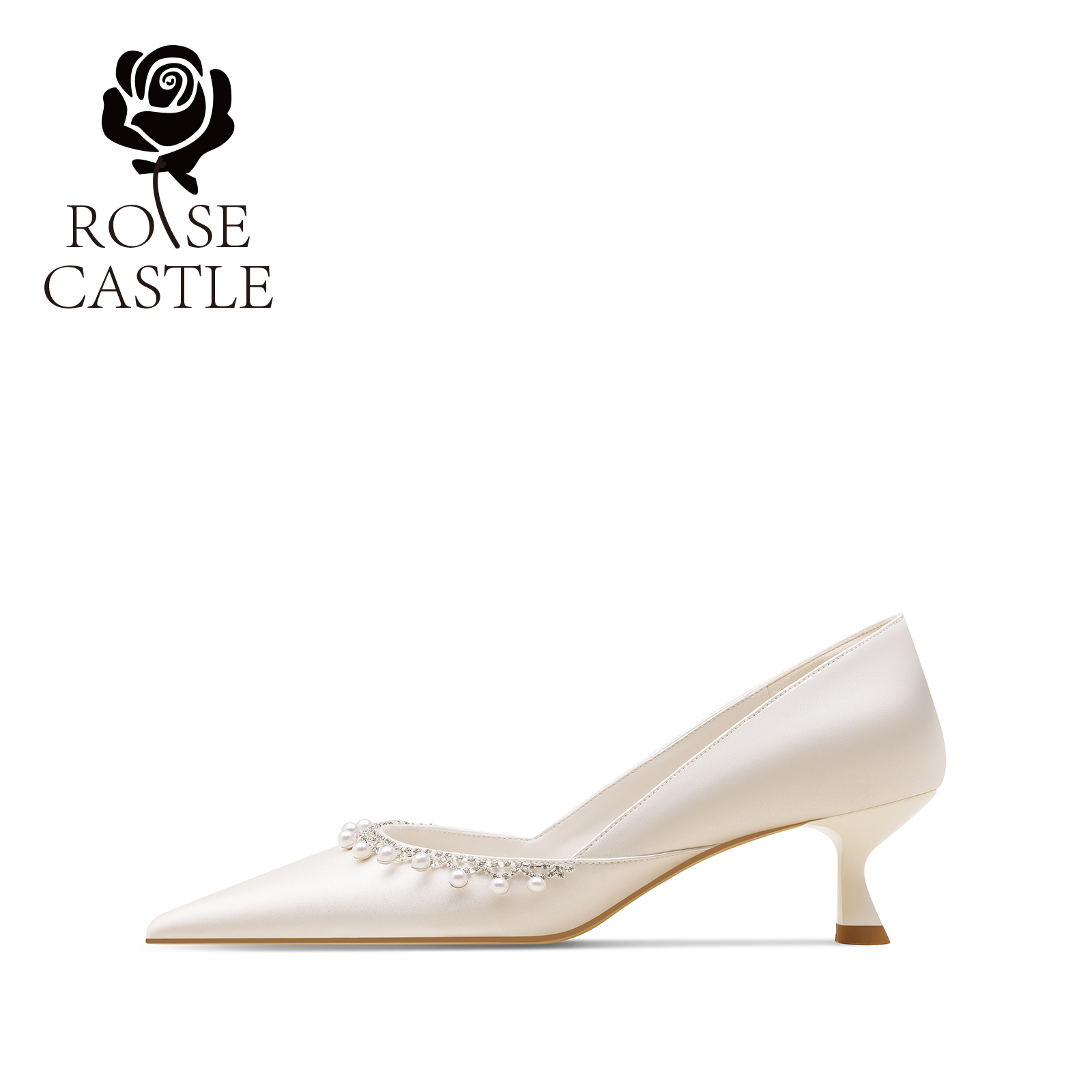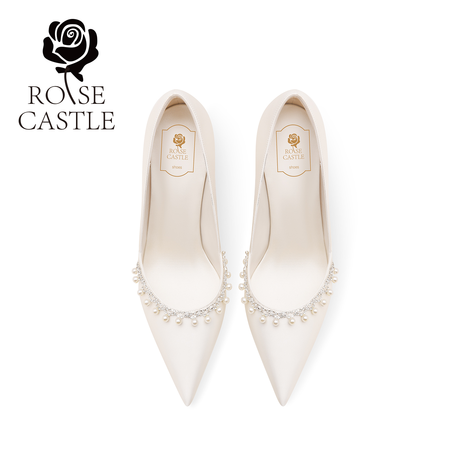 rosecastle 珍珠宴会礼服鞋 婚鞋 白色缎面高跟鞋 女新娘鞋 白川絮语