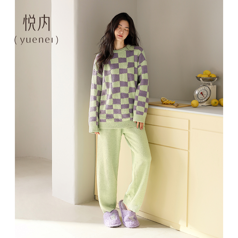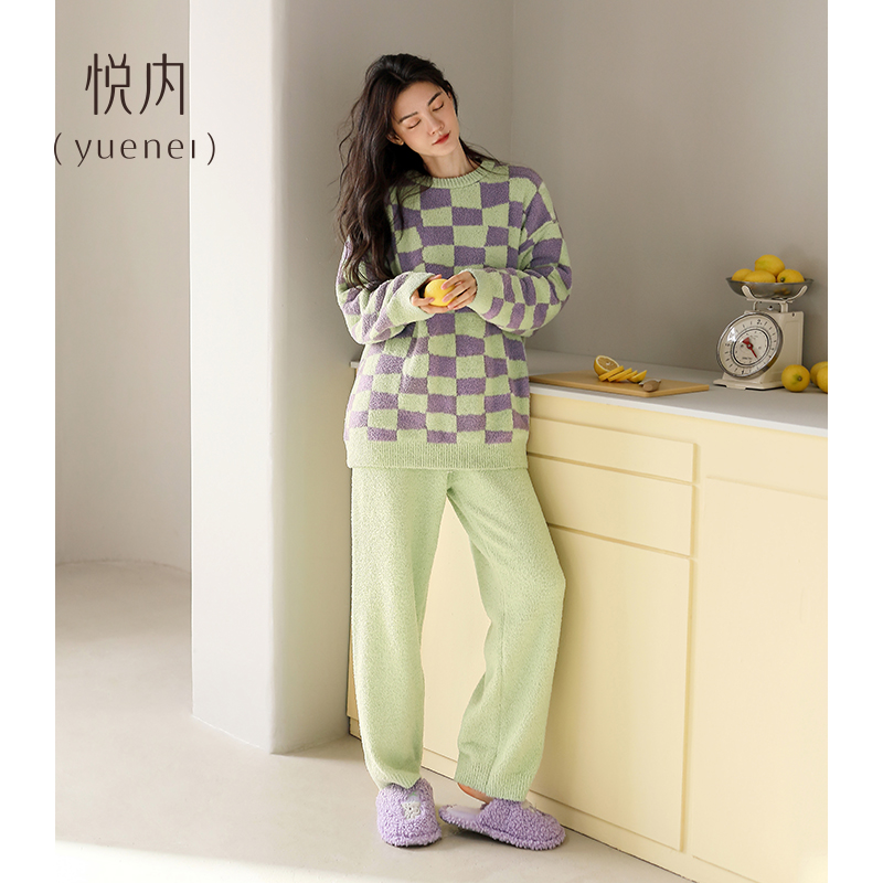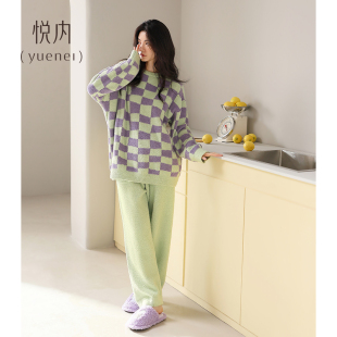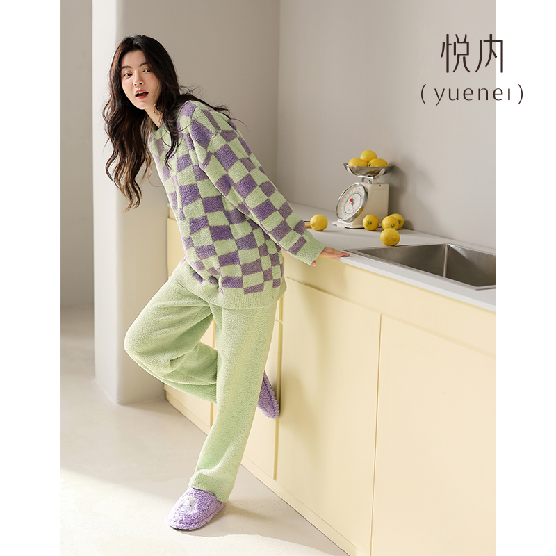 悦内半边绒睡衣女士冬季 珊瑚绒家居服保暖毛绒格子圆领套头 秋冬款