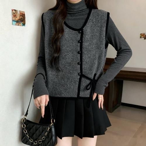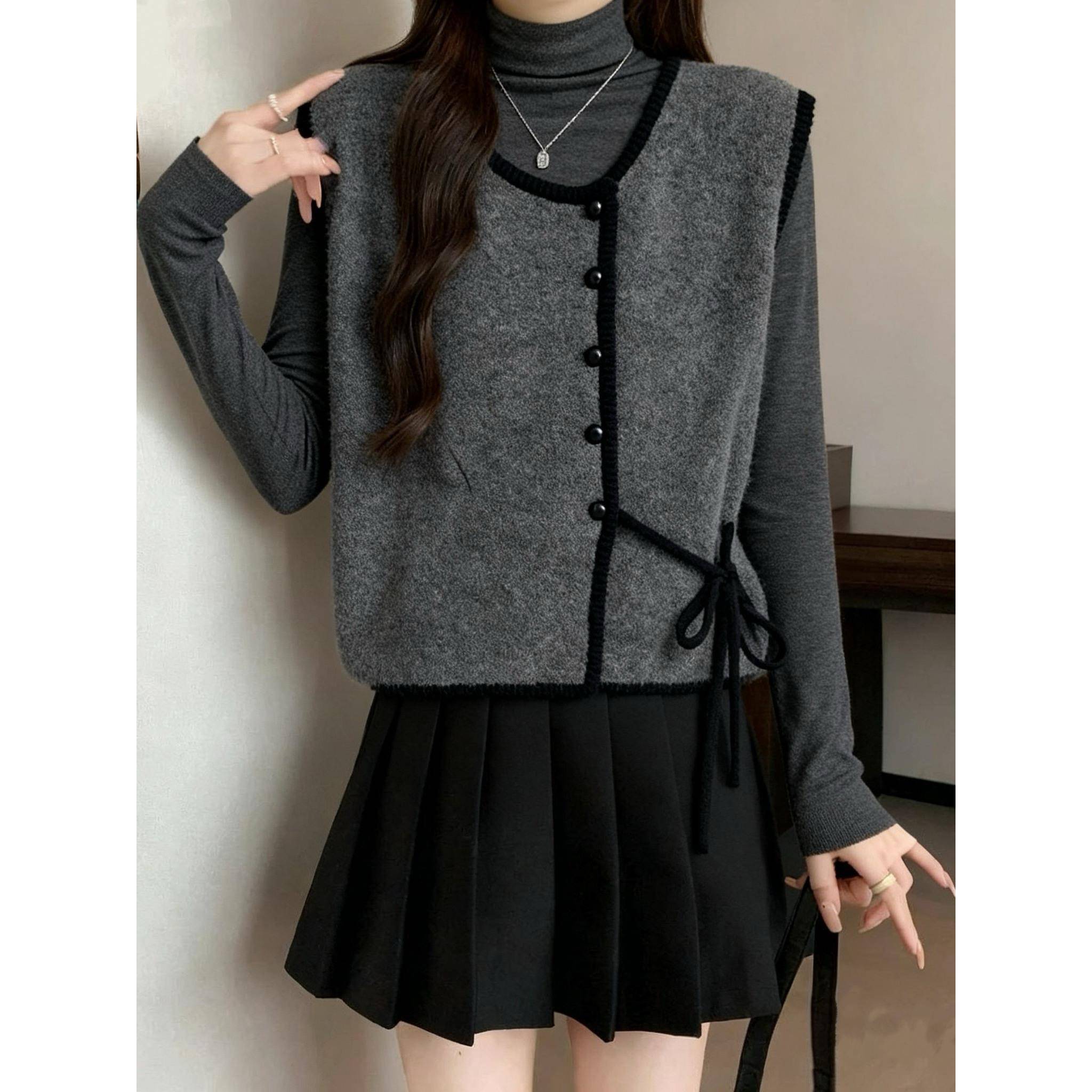 胖妹妹韩版 女大码 复古气质显瘦1007k 套装 秋冬打底内搭系带马甲衫