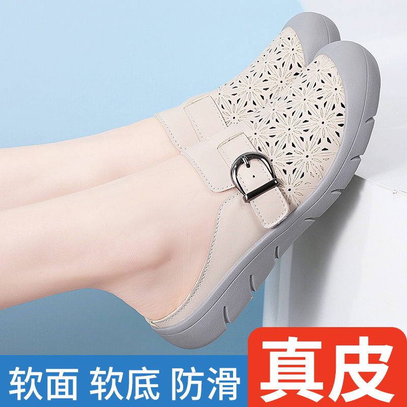 41到43妈妈鞋 大码 女士春秋中老年外穿一脚蹬懒人鞋 真皮包头半拖鞋