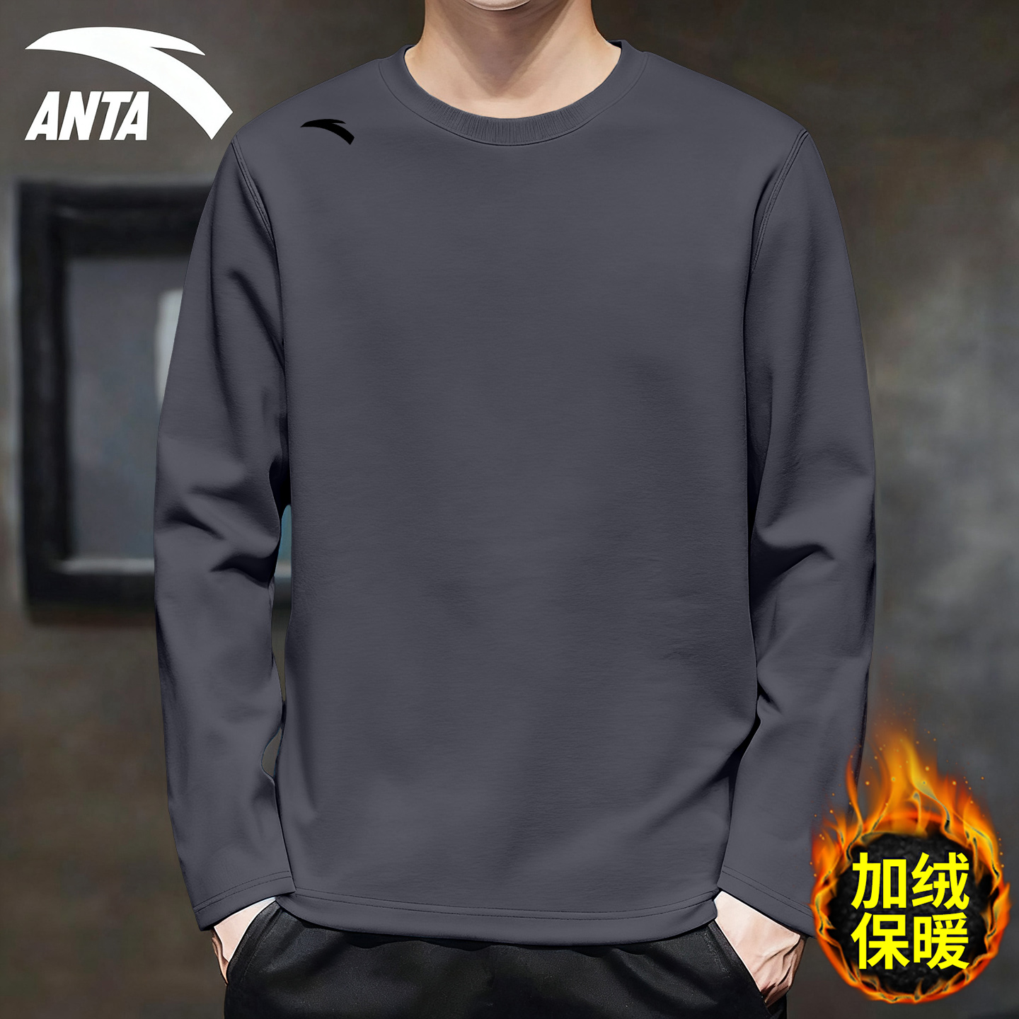 加绒保暖圆领套头衫 新款 宽松休闲运动内搭 T恤男2025冬季 安踏长袖