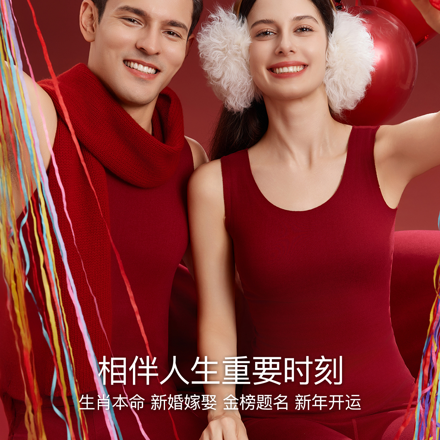 猫人本命年大红色保暖背心情侣款 男女士结婚内衣秋衣加厚德绒发热
