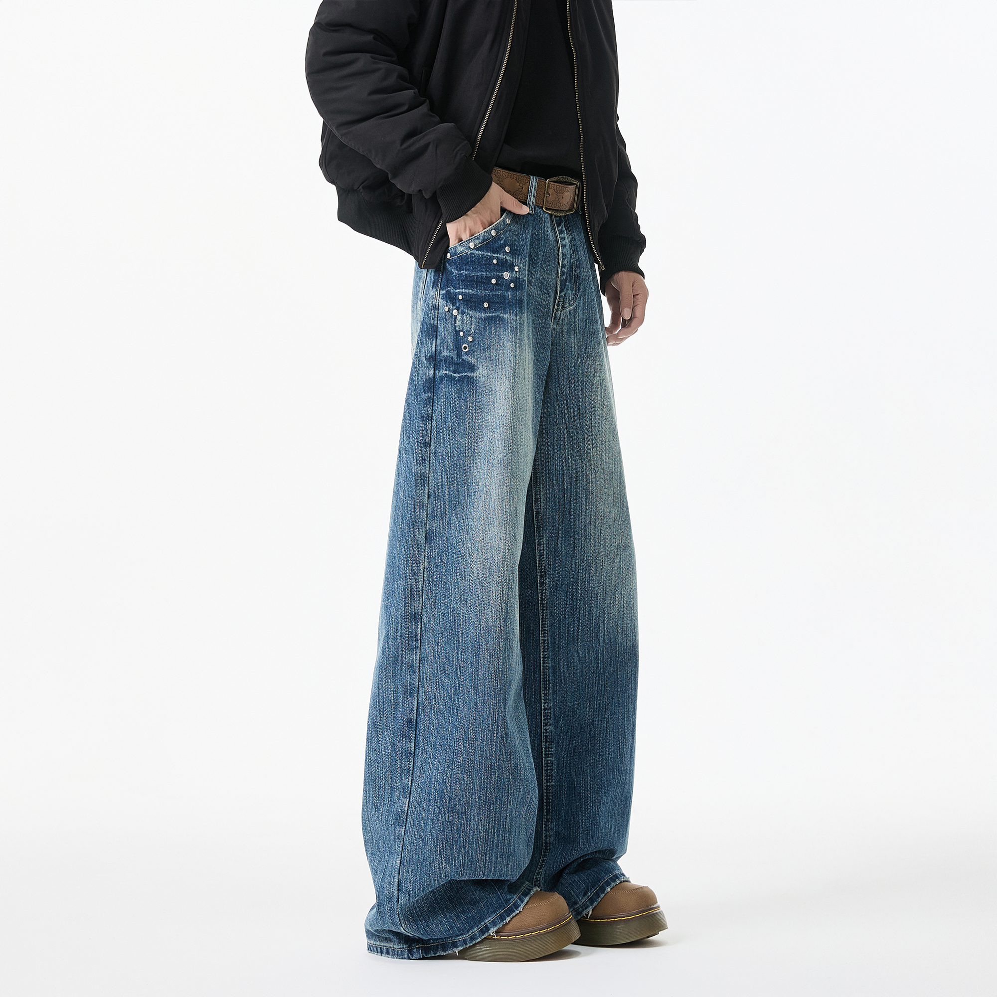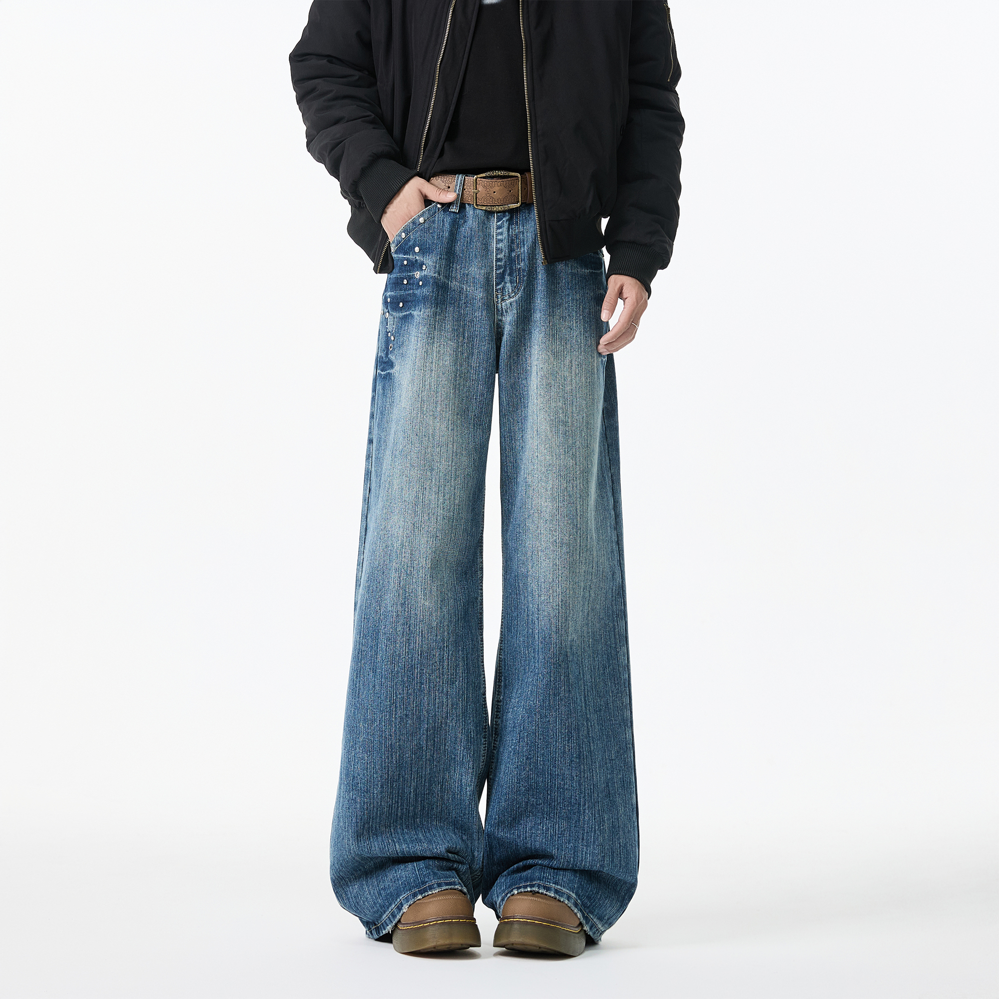 潮牌宽松阔腿直筒长裤 美式 新款 子男生秋季 复古水洗铆钉设计牛仔裤