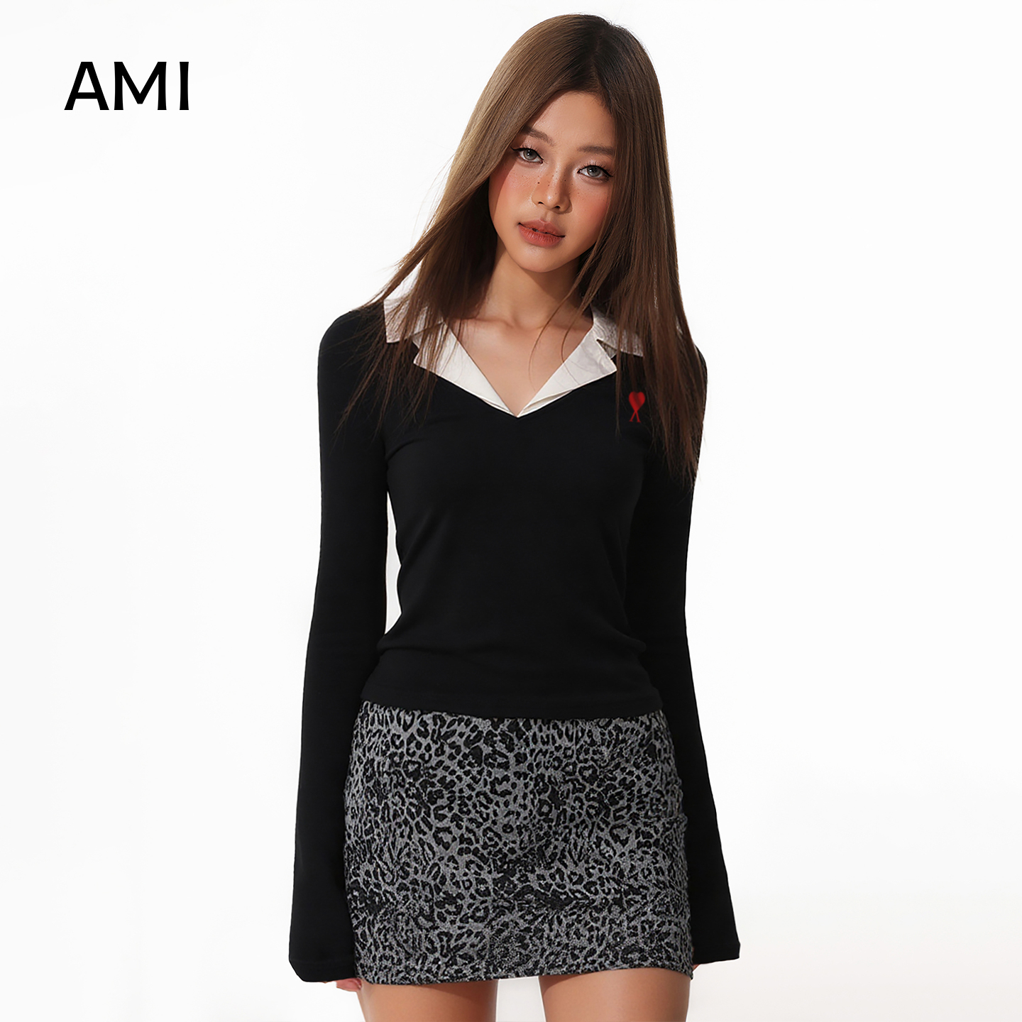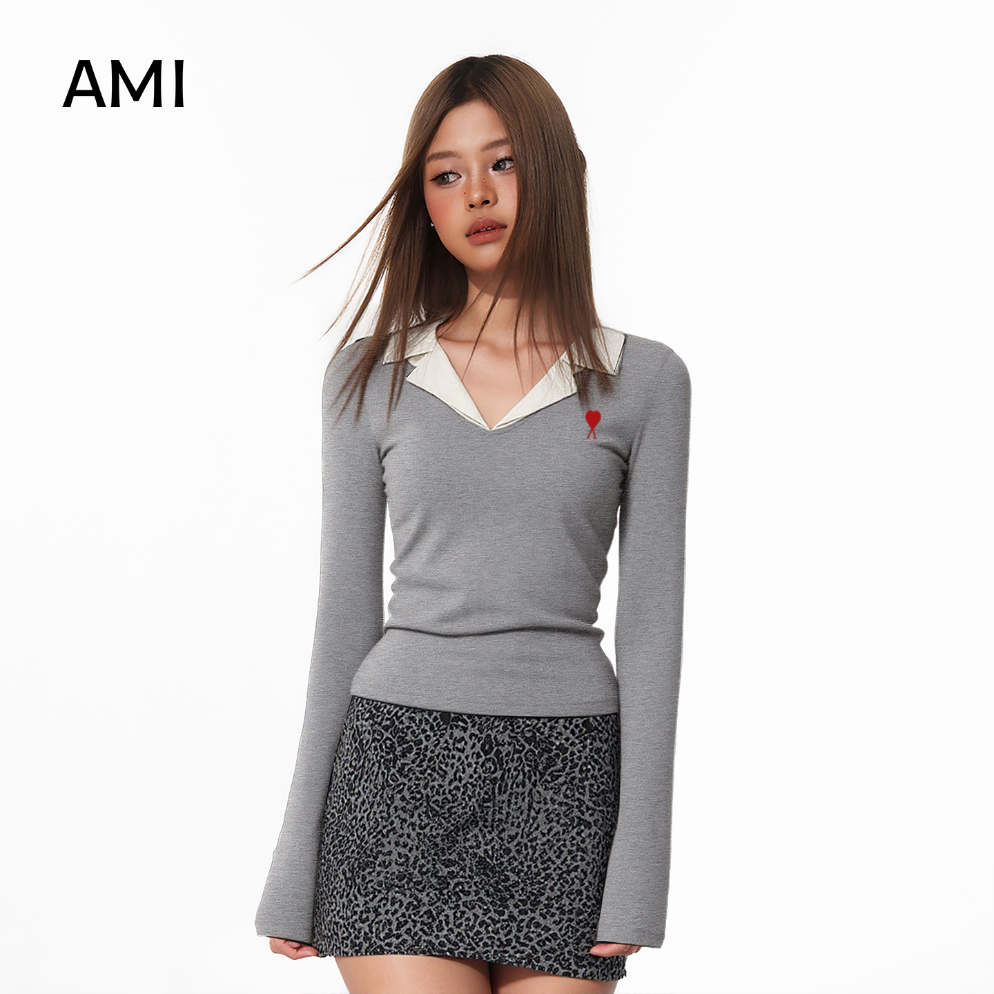 修身 AMI美式 新款 T恤女正肩针织早秋季 假两件上衣单穿 复古V领长袖