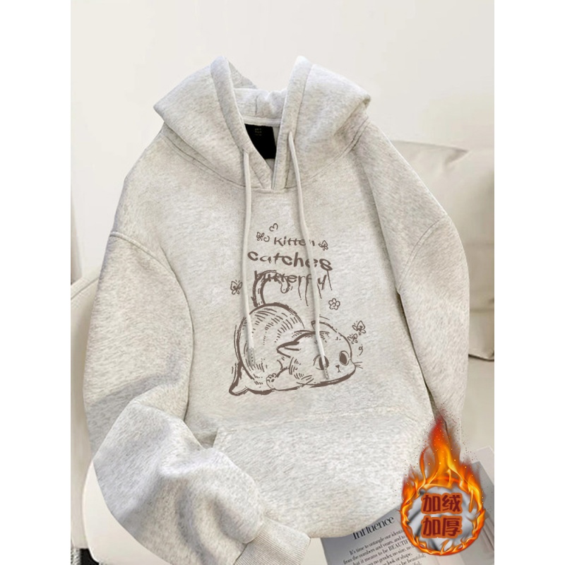 上衣秋冬加绒加厚外套 宽松大码 灰色猫咪连帽卫衣女2025年新款 爆款