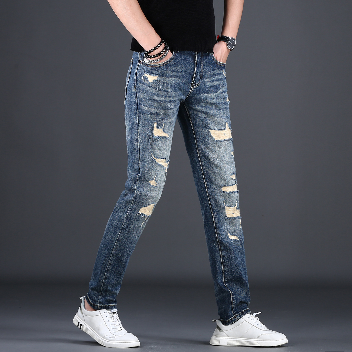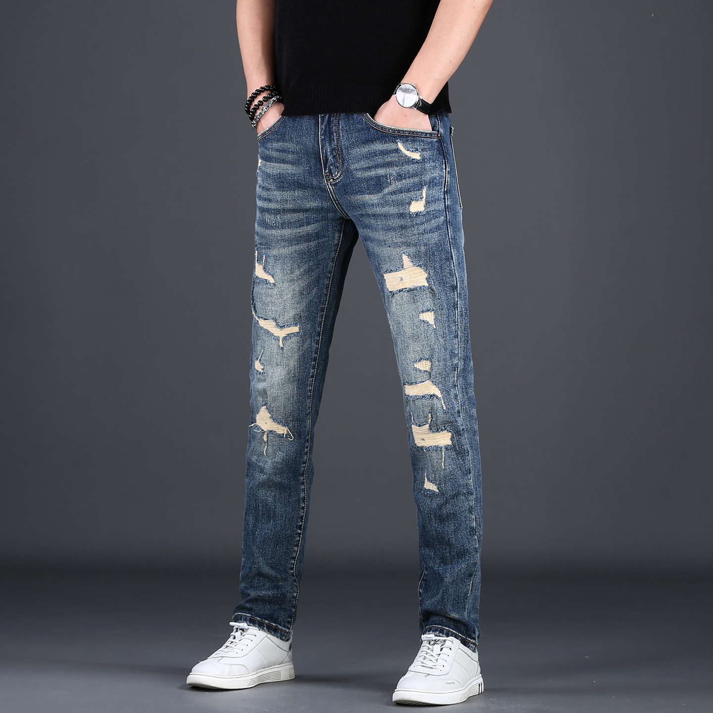 男款 破洞牛仔裤 修身 小脚裤 子男 秋季 潮流复古潮牌百搭长裤 2025新款