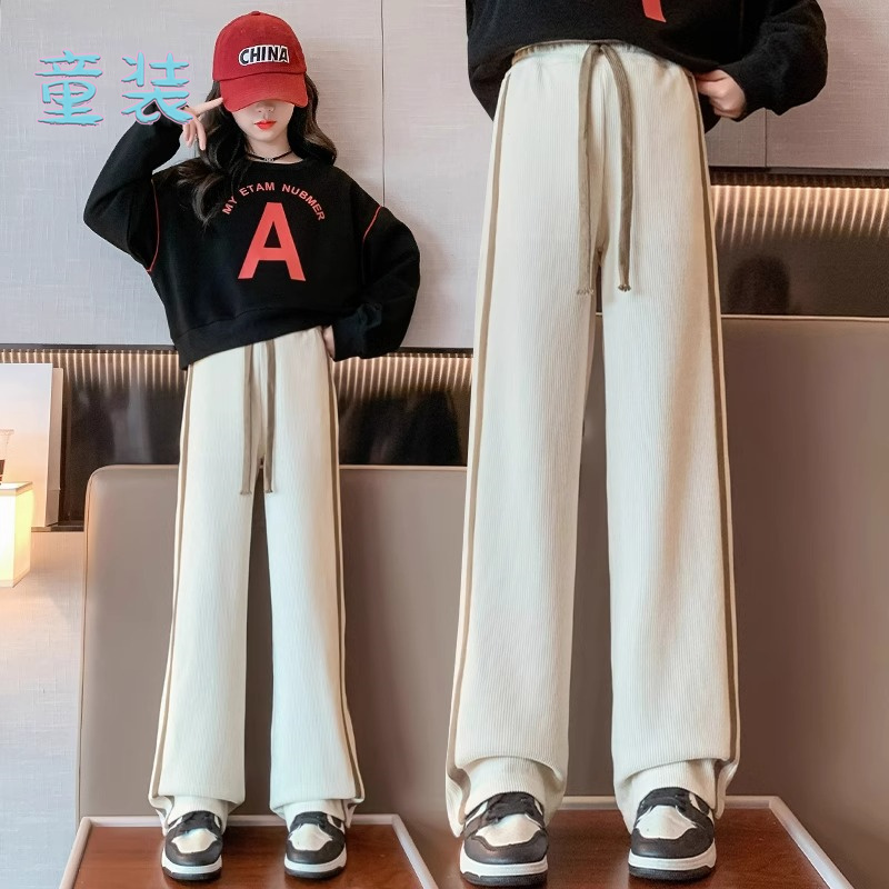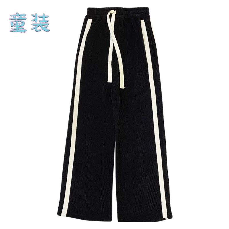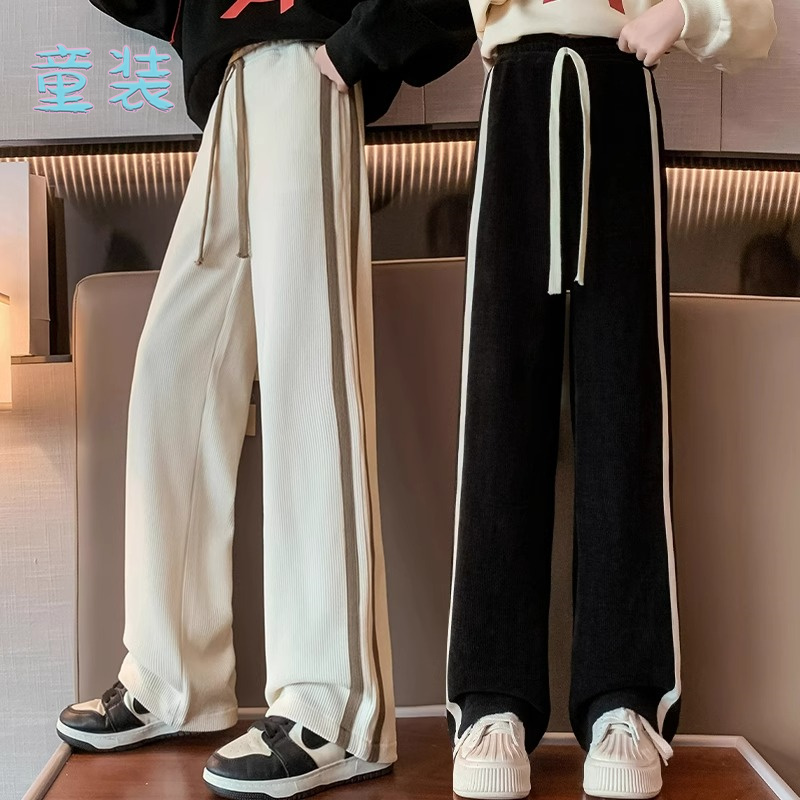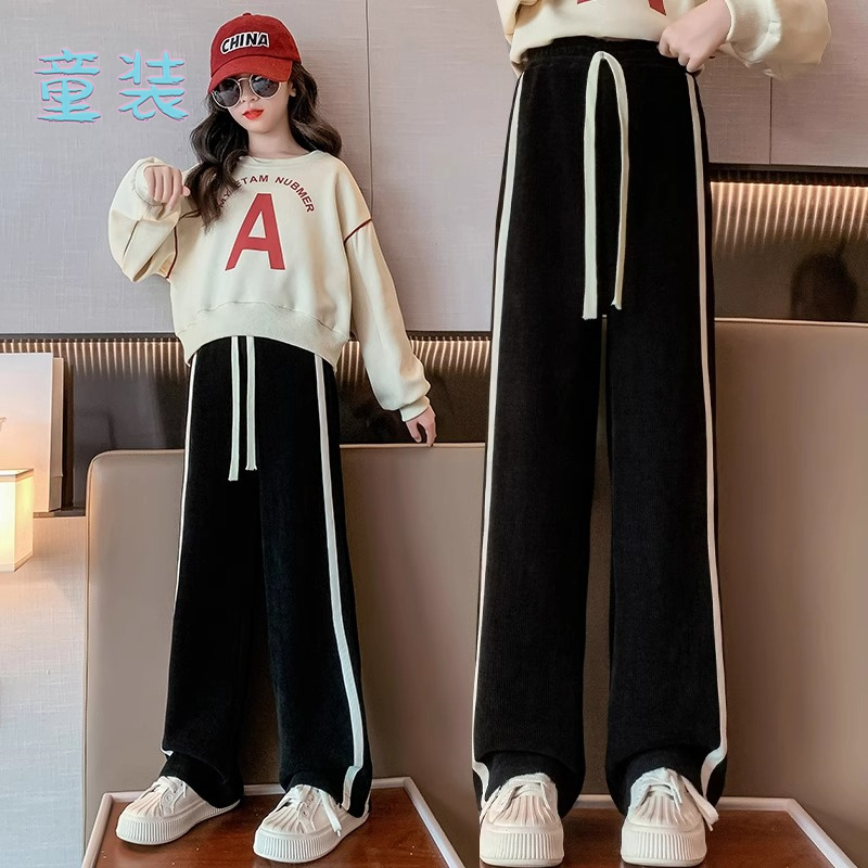 潮 女童运动长裤 儿童侧边条纹秋冬直筒裤 中大童休闲加绒加厚阔腿裤