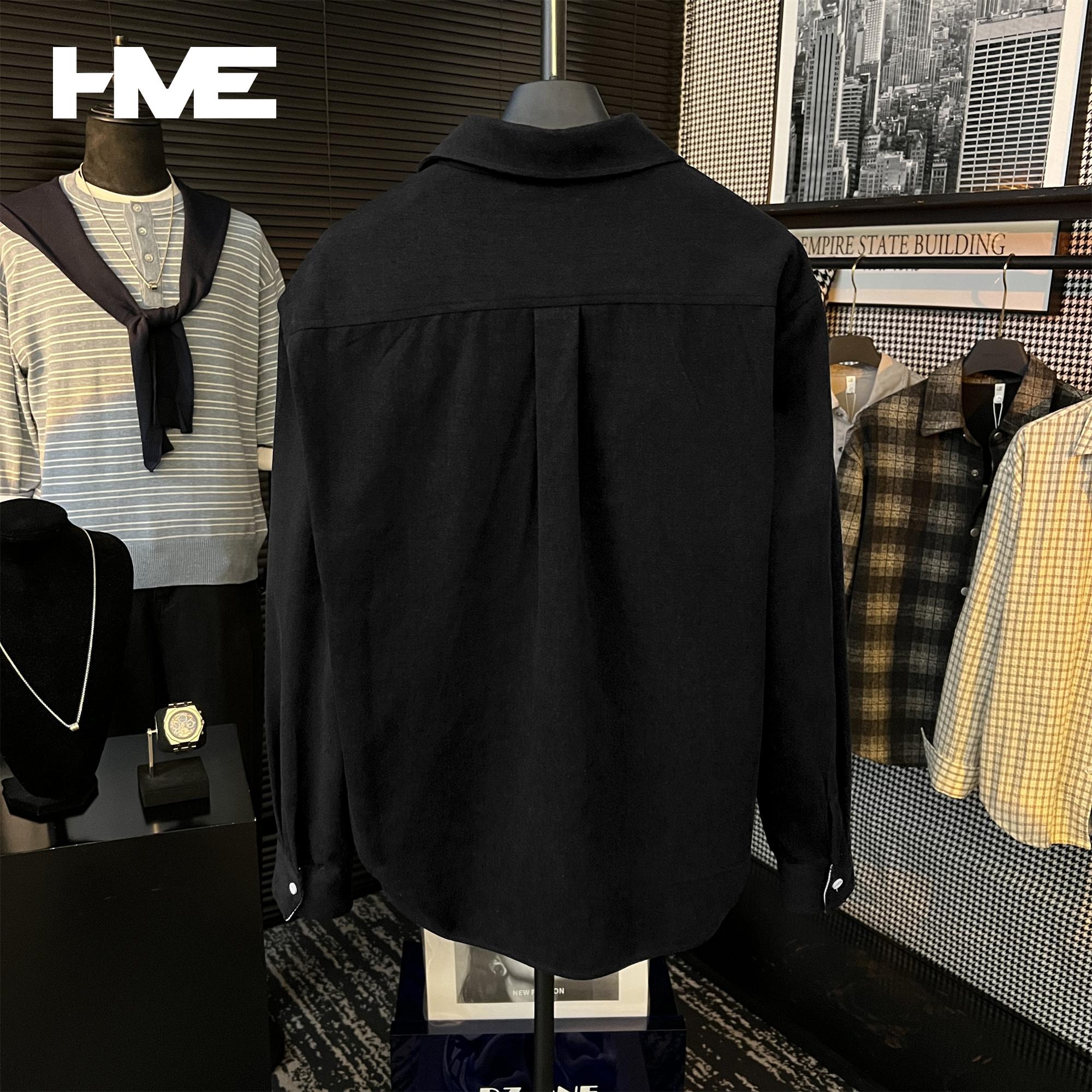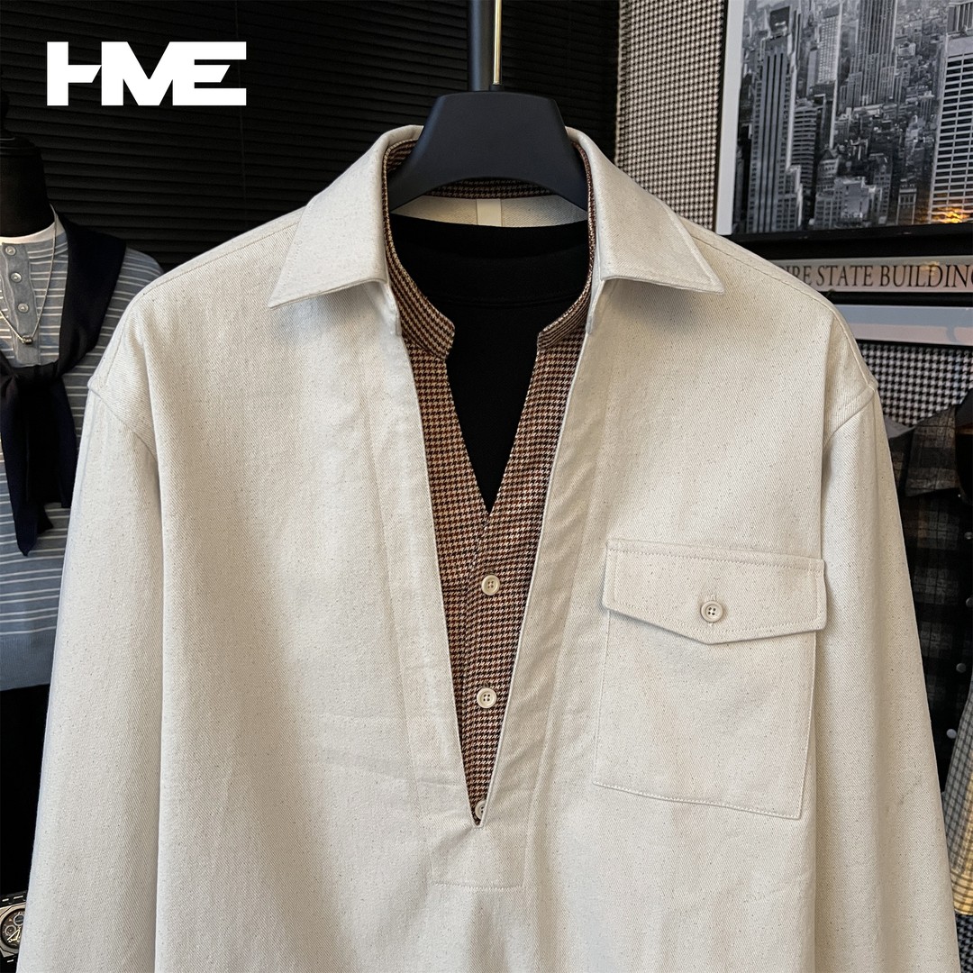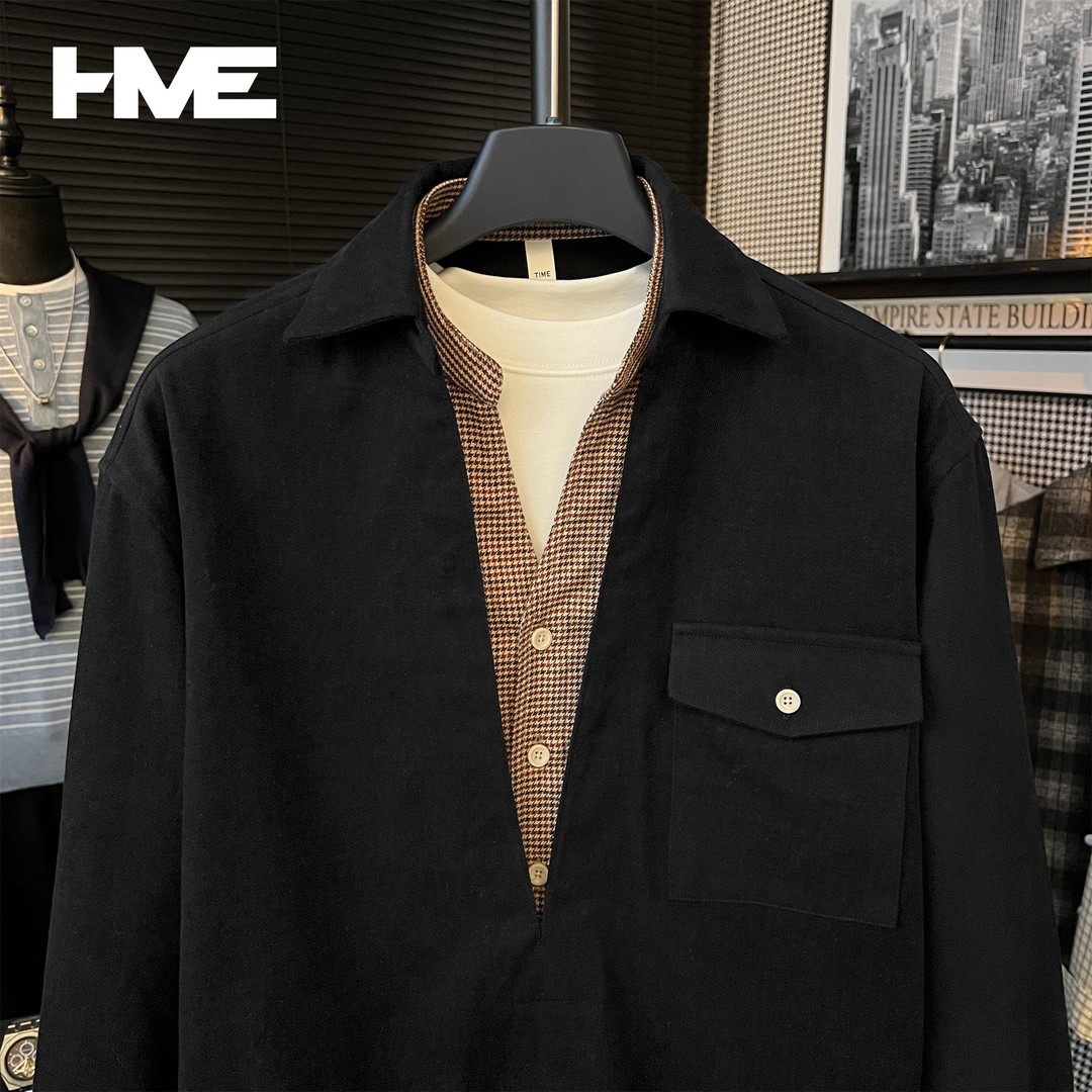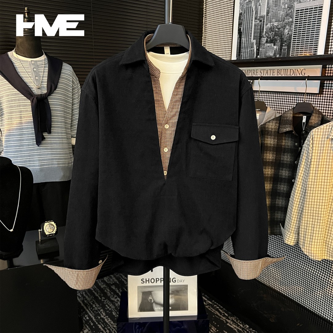 2025秋冬新款 男士 潮牌撞色高级感上衣 衬衫 格纹拼接假两件翻领长袖
