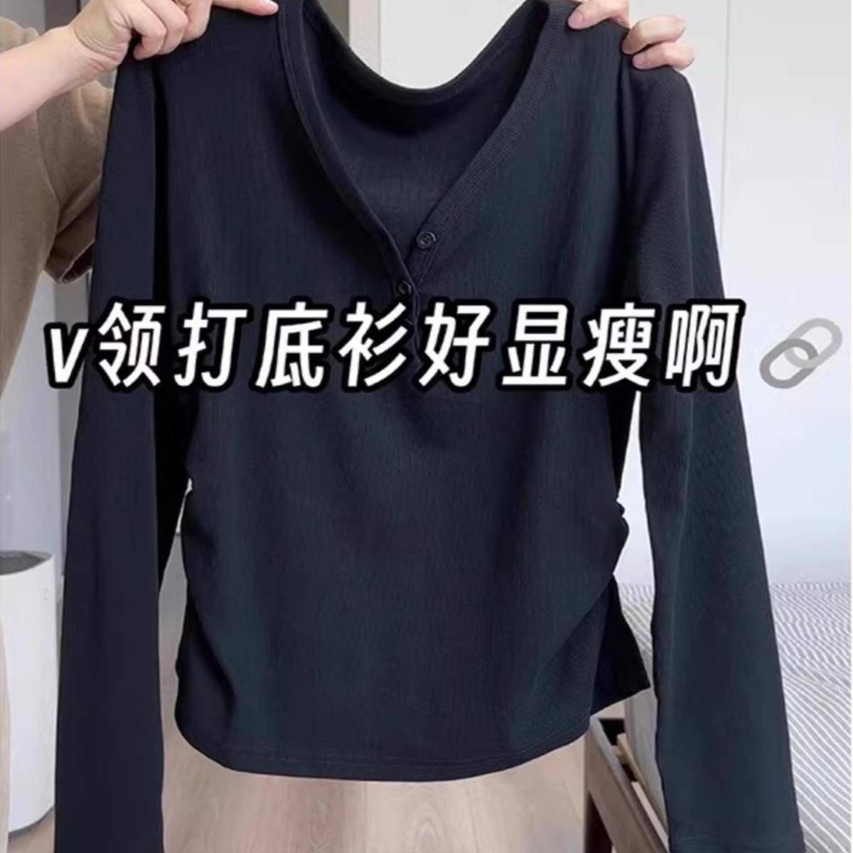 季 感加绒内搭长袖 女款 大码 上衣1008r1 2025新款 白色v领正肩打底衫