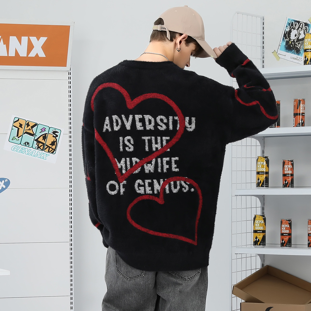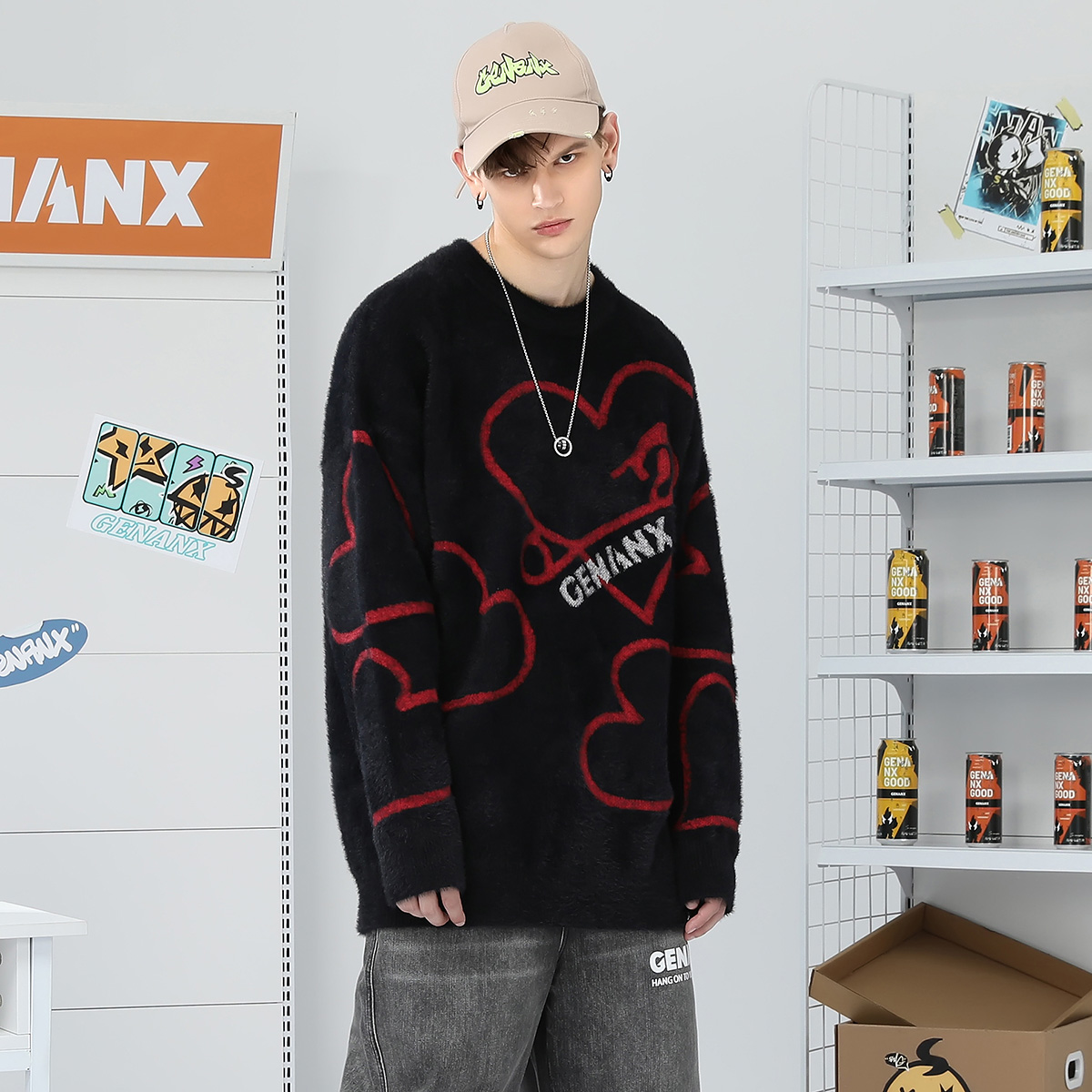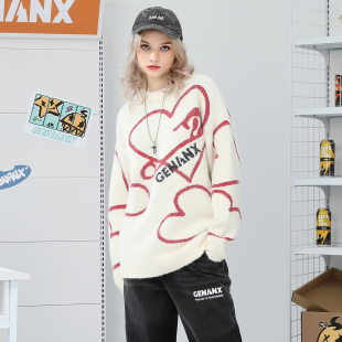 潮 毛衣针织衫 GENANX闪电潮牌爱心印花宽松落肩袖 保暖套头情侣装