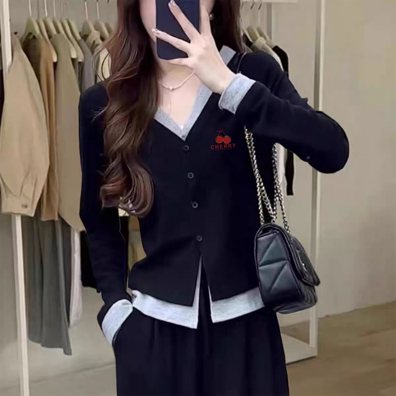 高级感拼接欧货内搭黑色上衣爆款 假两件v领长袖 短款 修身 T恤女新款