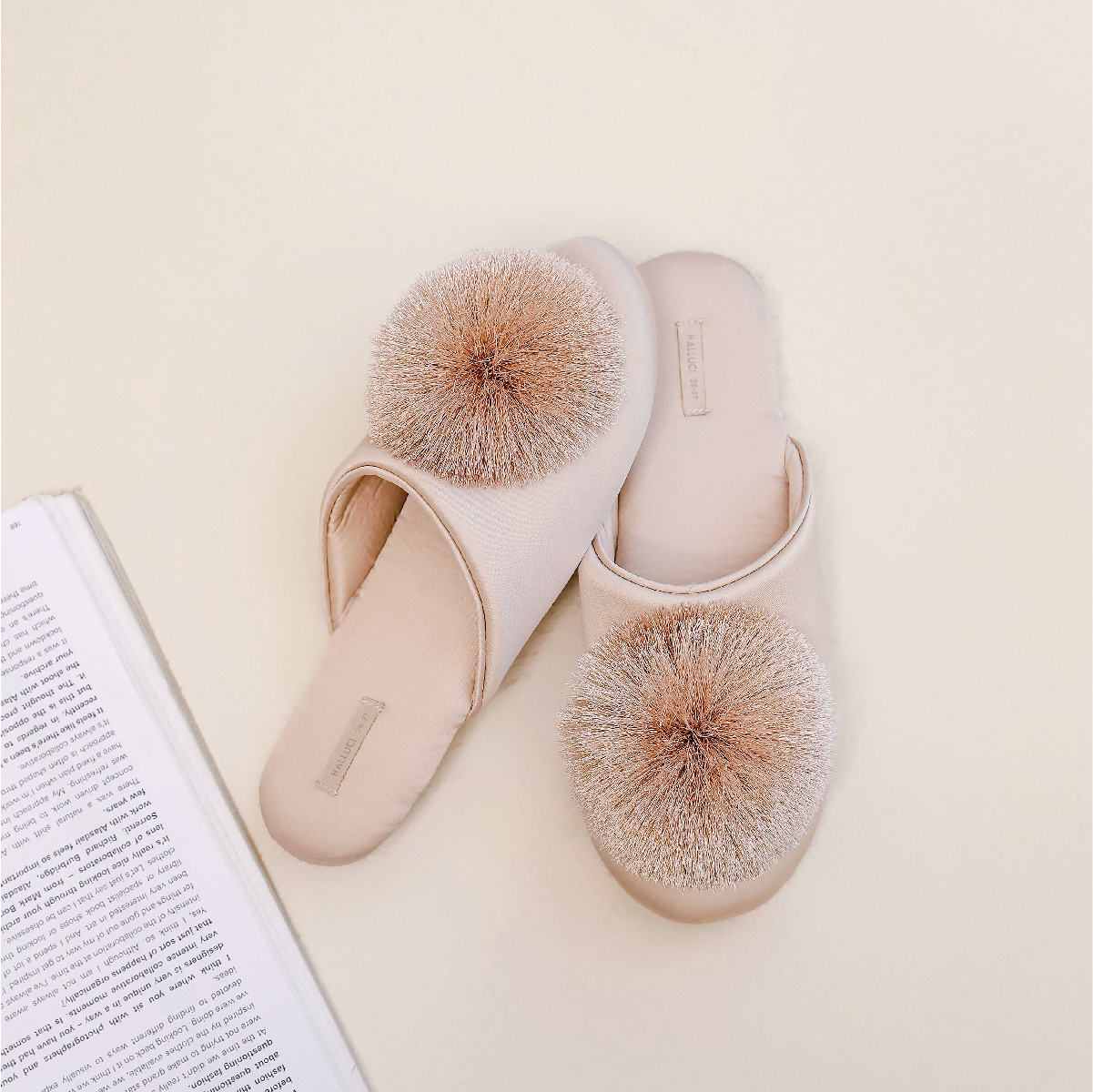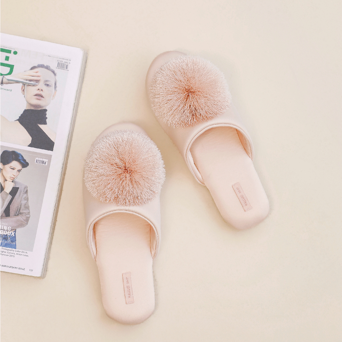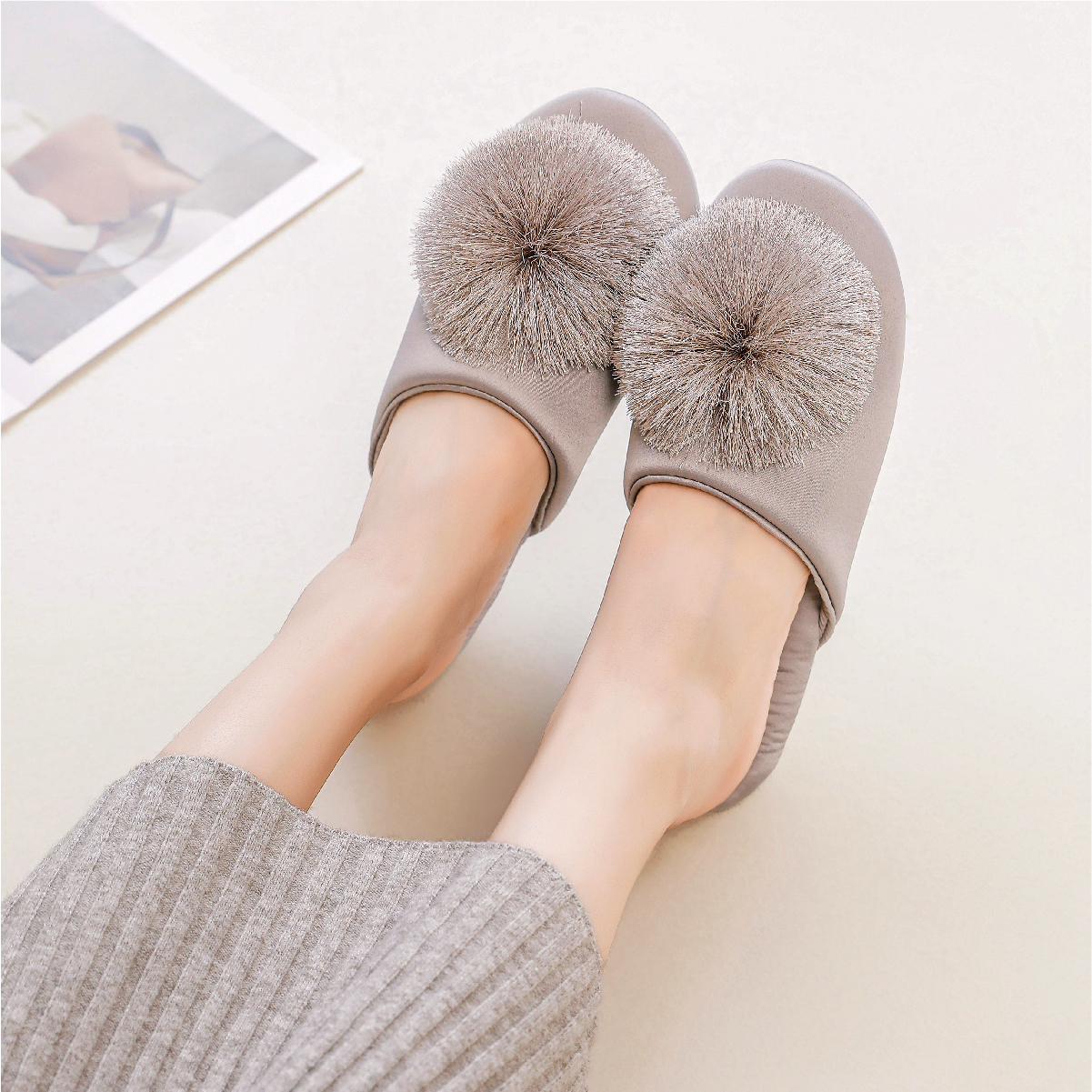 女 亲肤橡胶底防滑居家拖鞋 奢华缎面流苏球装 饰纯色家用拖鞋