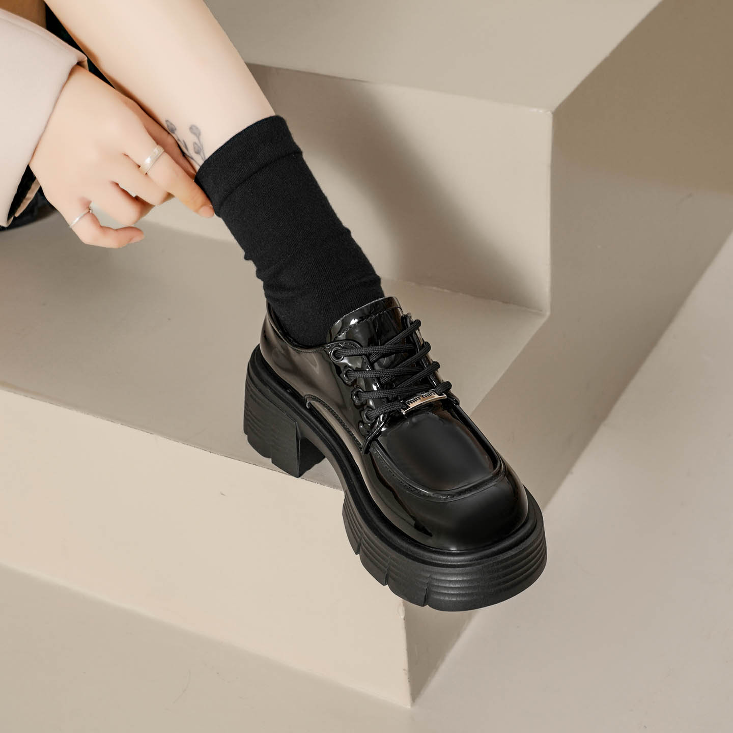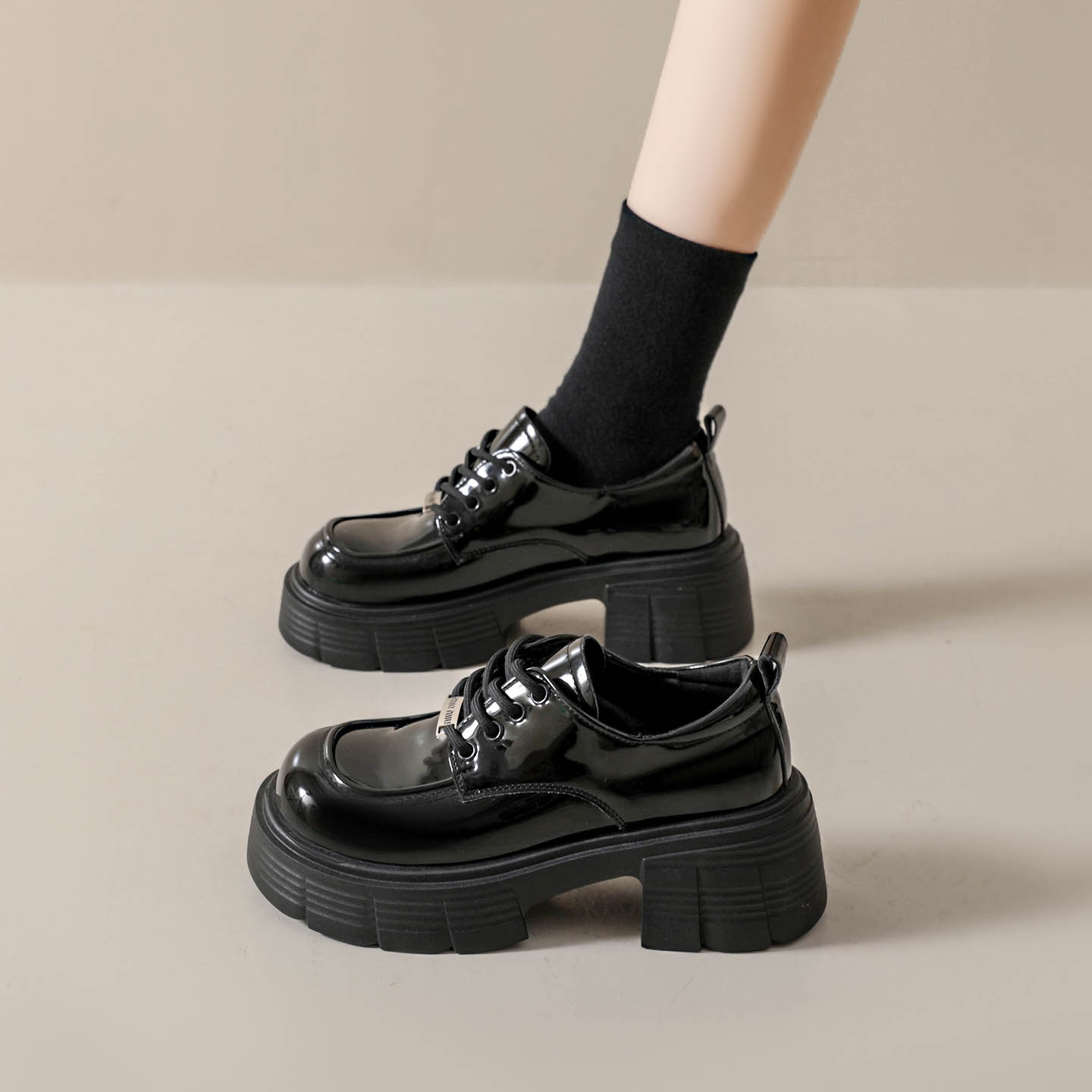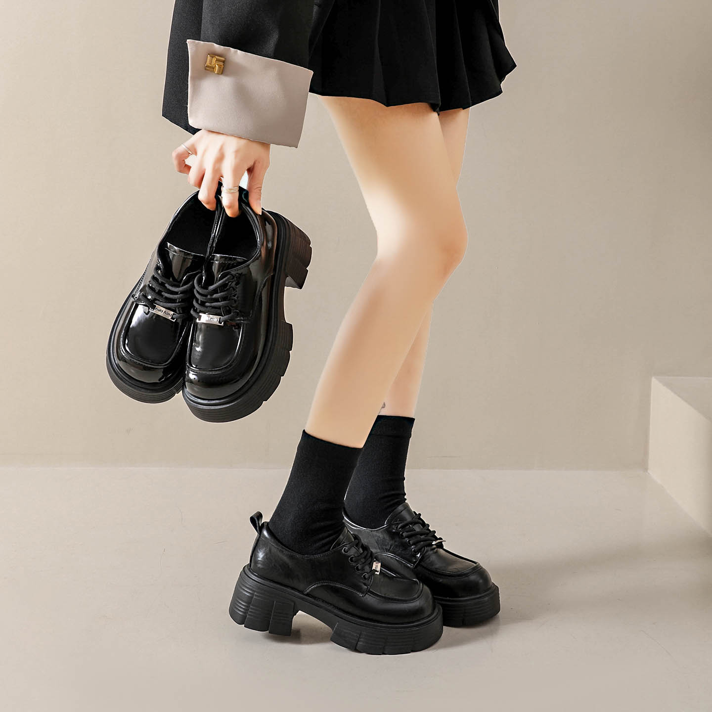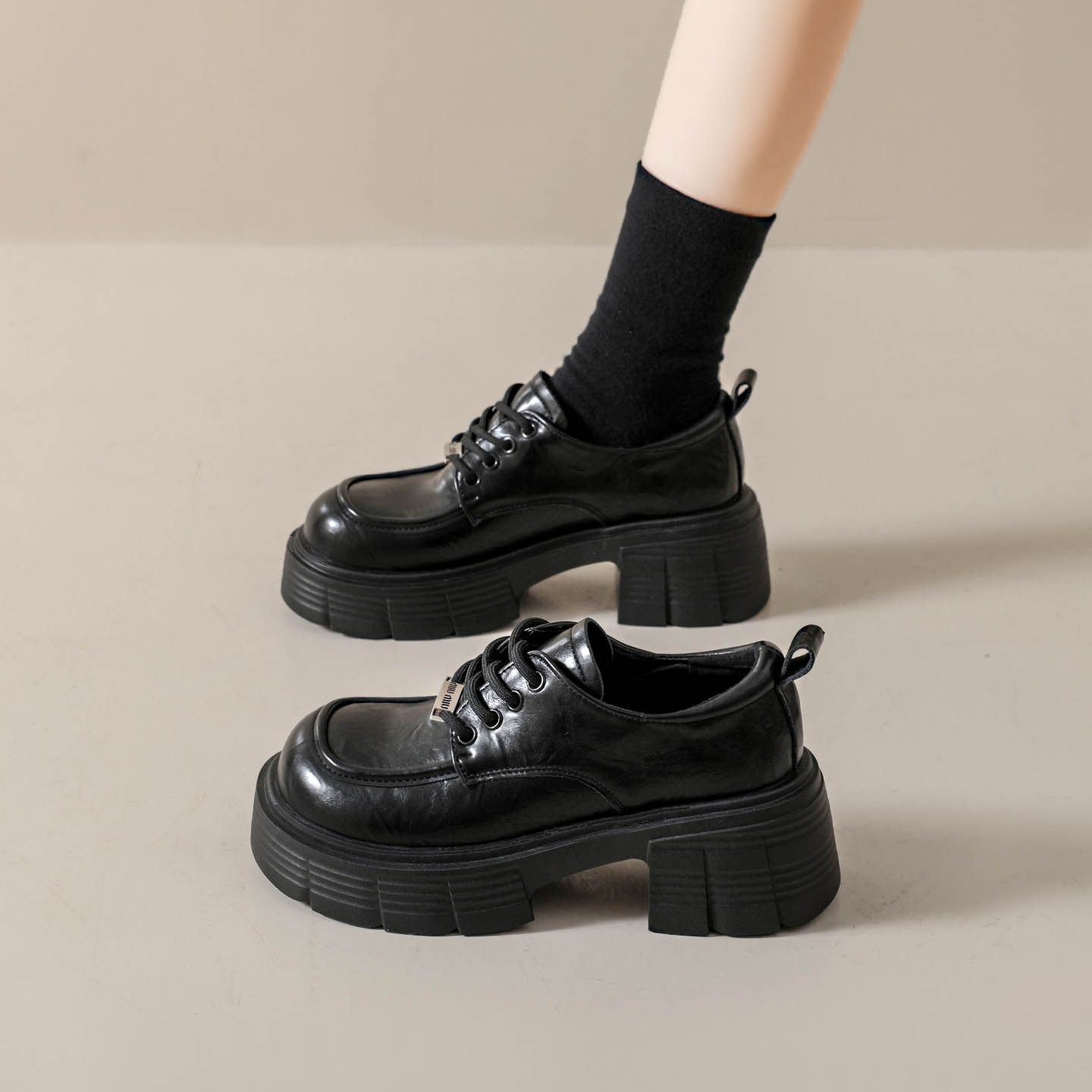 真皮单鞋 踩屎感英伦风厚底小皮鞋 黑色系带粗跟增高乐福鞋 秋季 女款