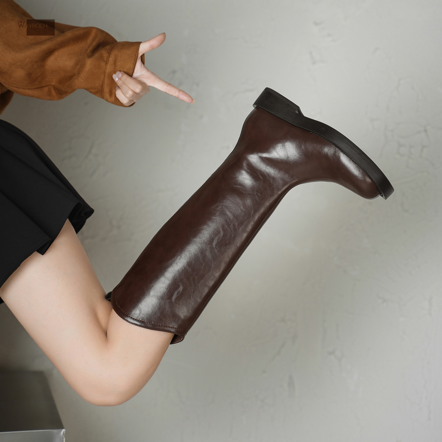 玮保 厚底平跟高筒骑士靴女圆头平底一脚蹬宽靴马靴长靴子冬 真皮