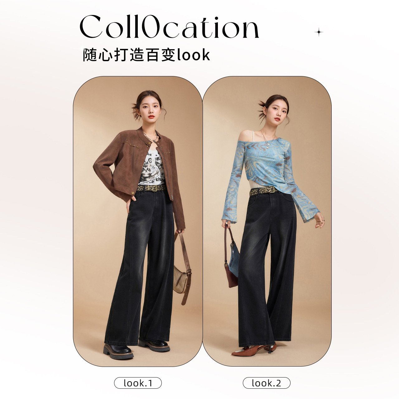 新款 子2025冬季 韩版 时尚 IEF 通勤气质加绒百搭牛仔阔腿裤 爱依服裤