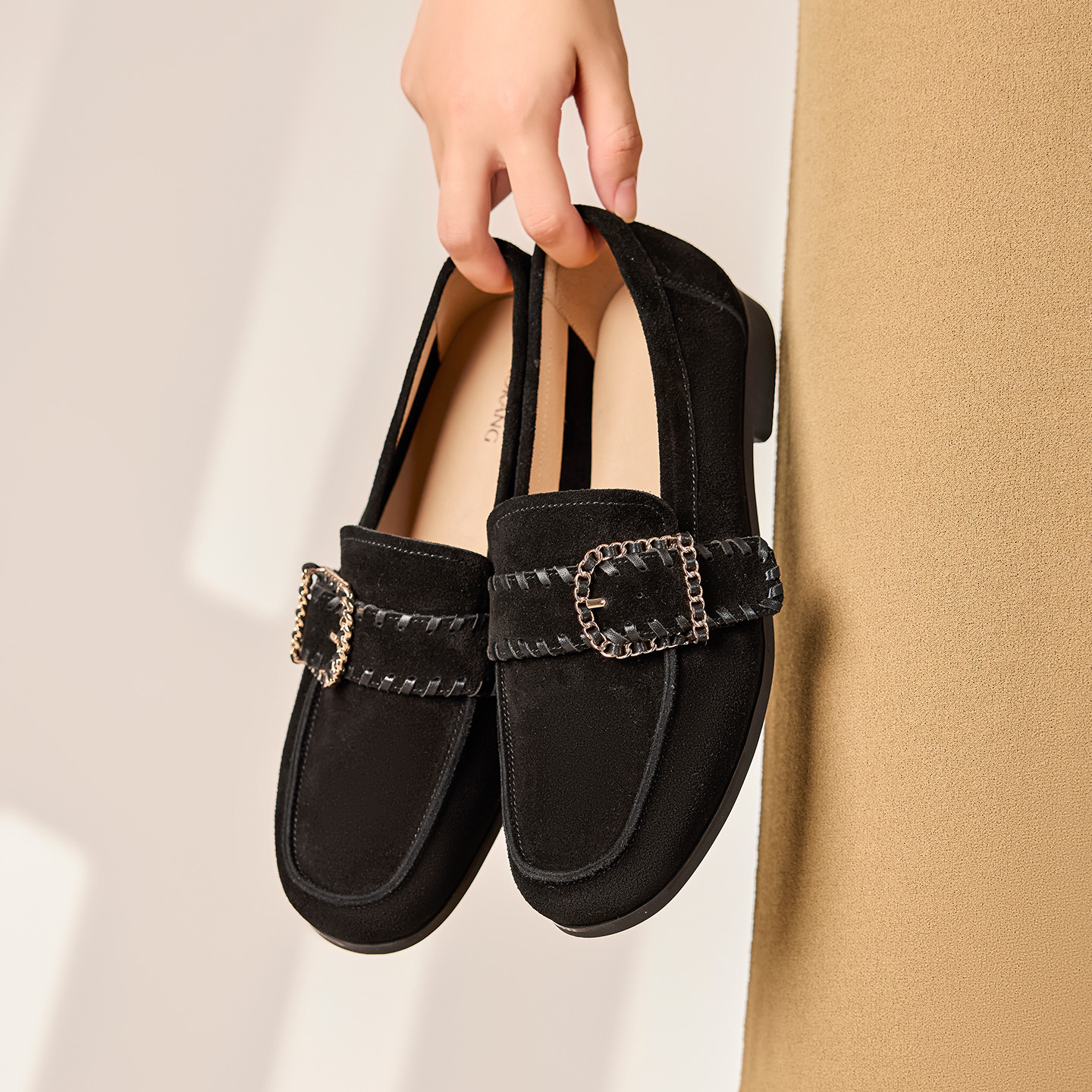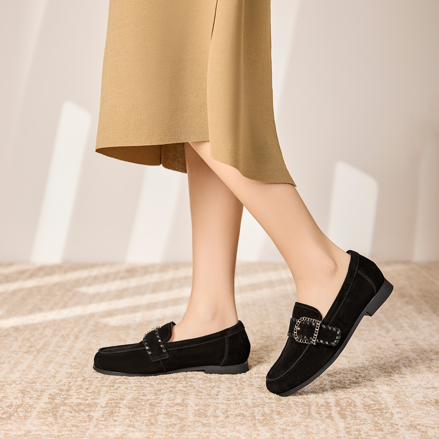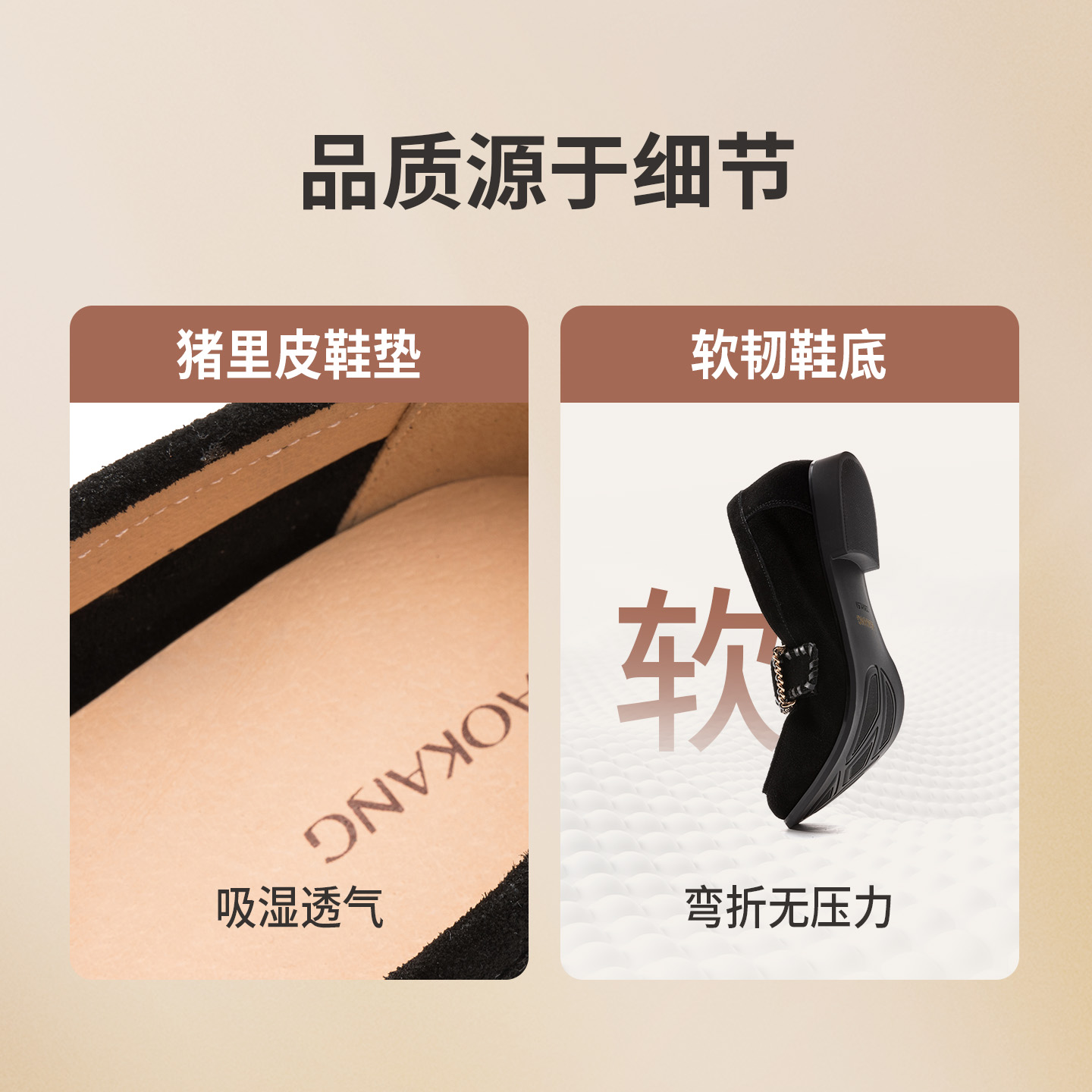 女鞋 一脚蹬平底通勤皮鞋 2025秋季 真皮黑色单鞋 绒面乐福鞋 奥康