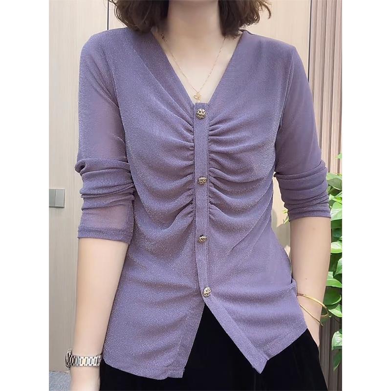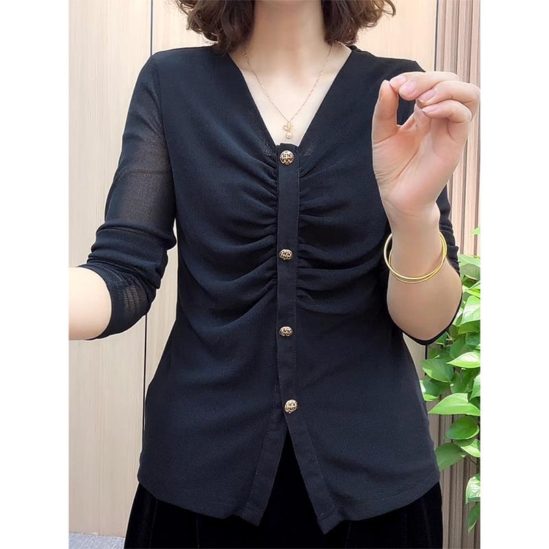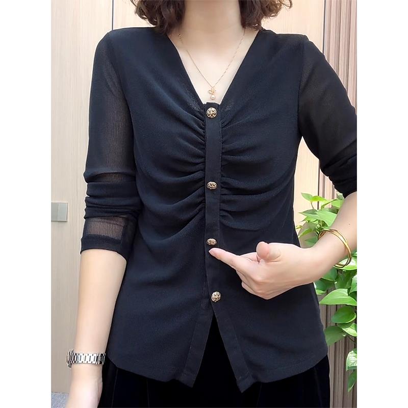 洋气显瘦百搭打底小1009u 时尚 秋冬黑色V领网纱褶皱长袖 上衣女新款