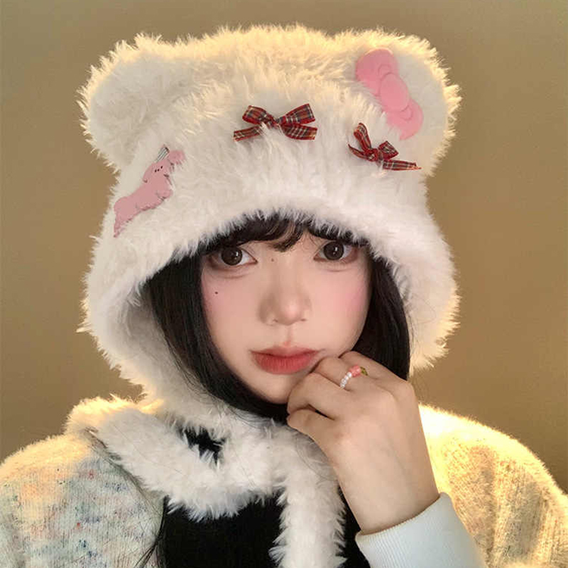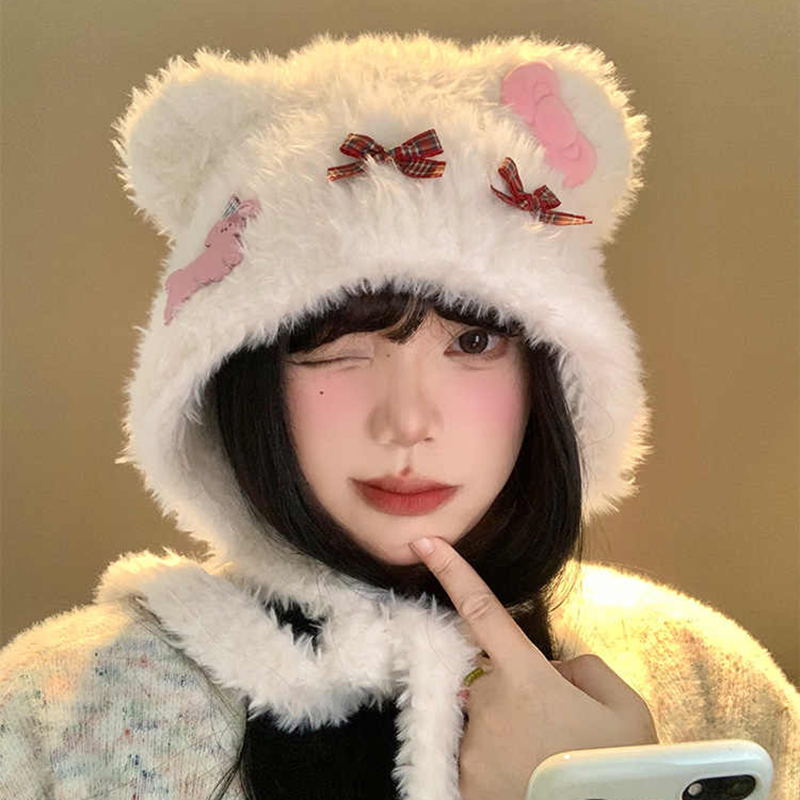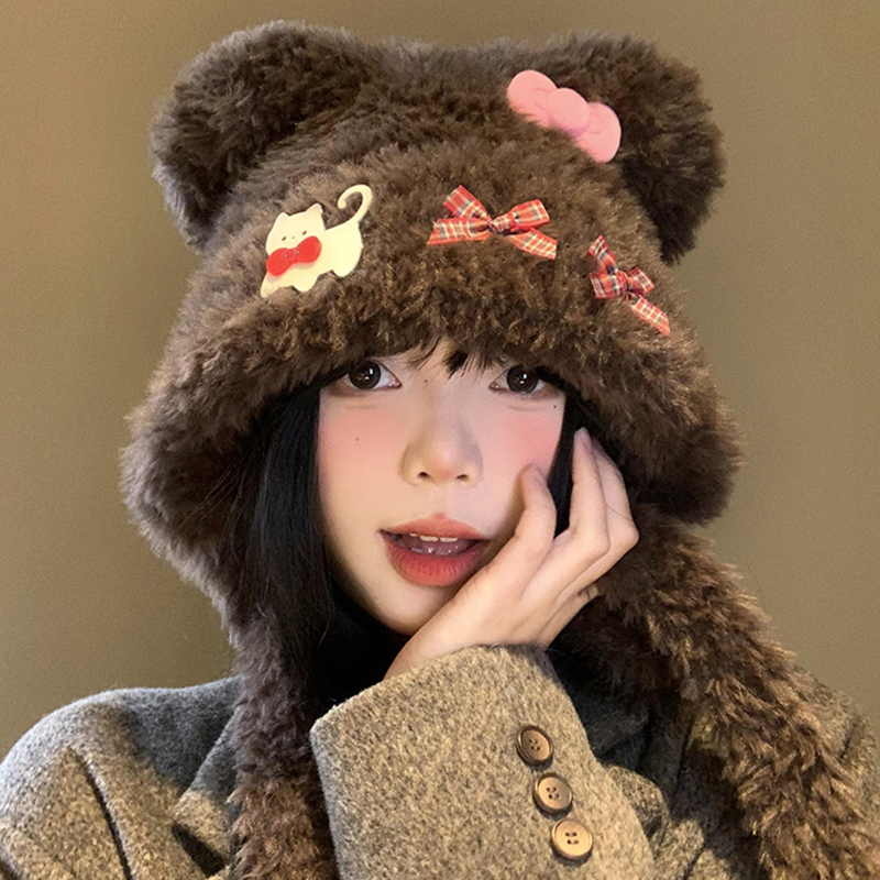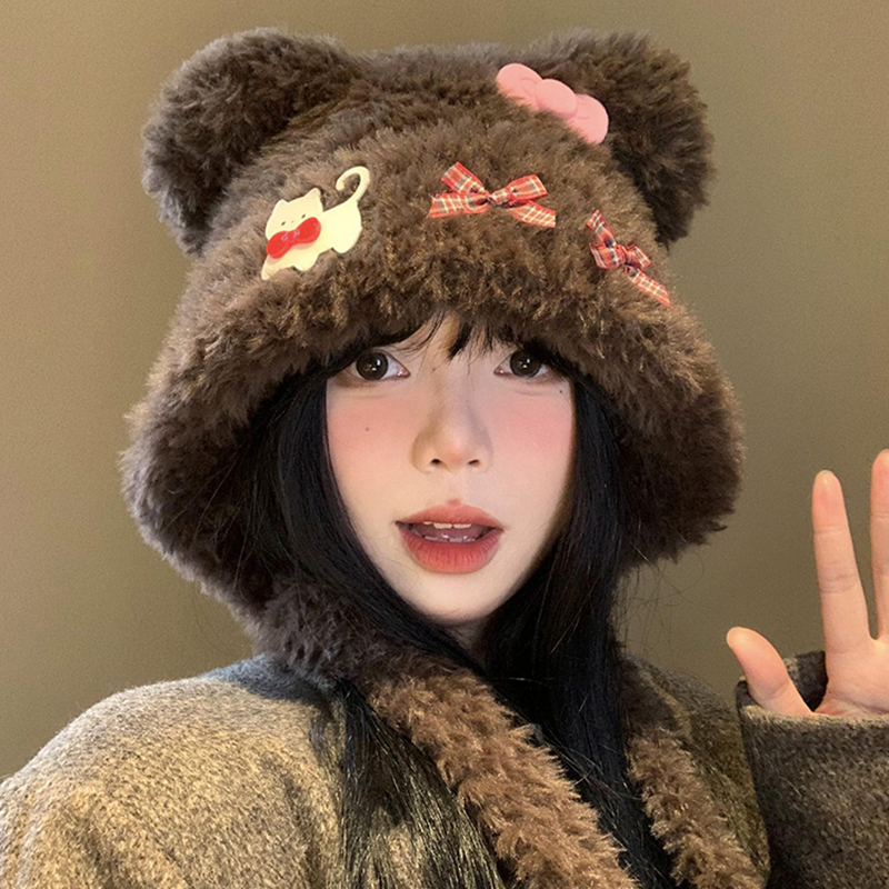 毛绒小熊帽子女秋冬季 可爱毛茸茸冬天保暖防寒加厚护耳帽子2025款