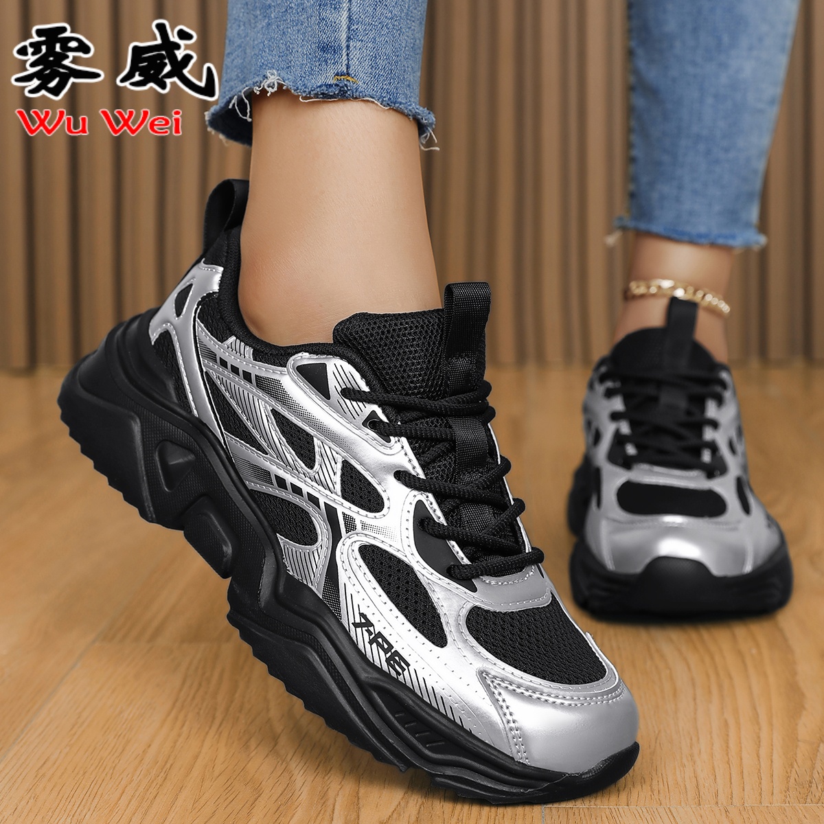 2025秋季 骆驼女鞋 新款 休闲透气老爹鞋 女 厚底增高银色运动鞋 银熠