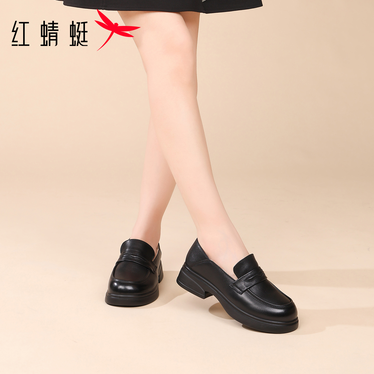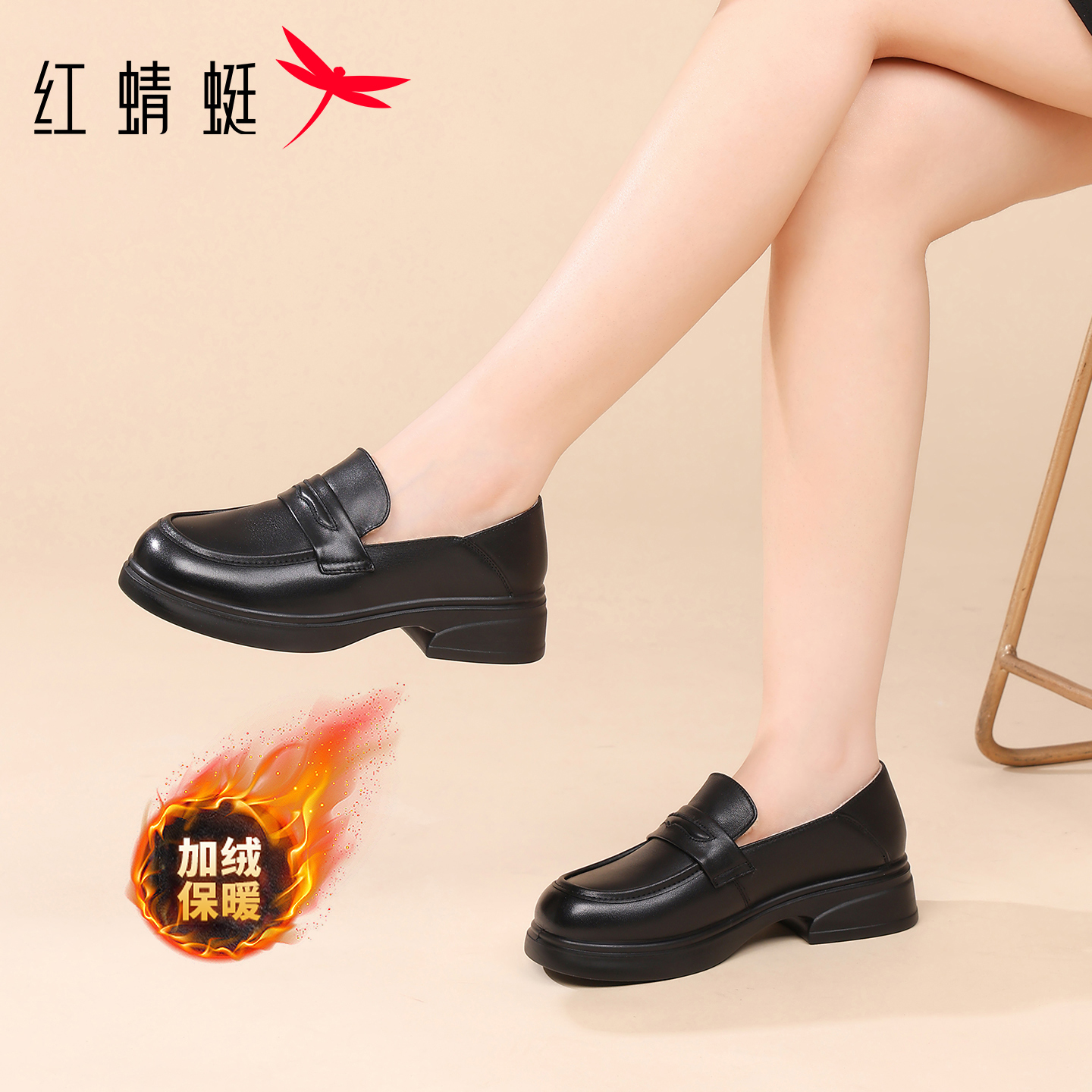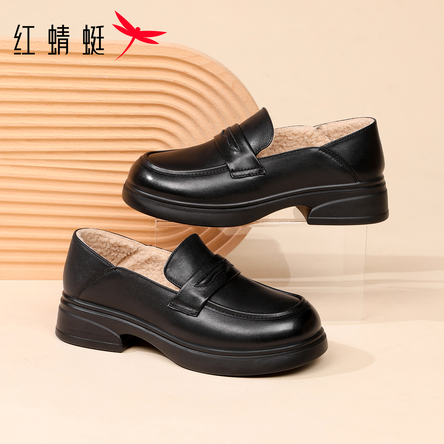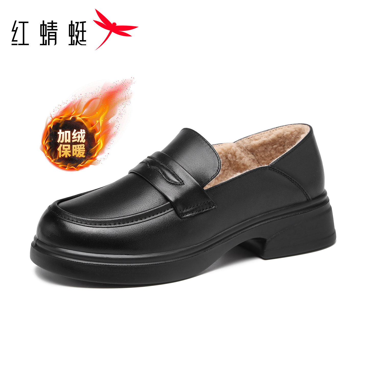 通勤乐福鞋 厚底妈妈单鞋 冬季 一脚蹬小皮鞋 加绒保暖棉鞋 红蜻蜓女鞋