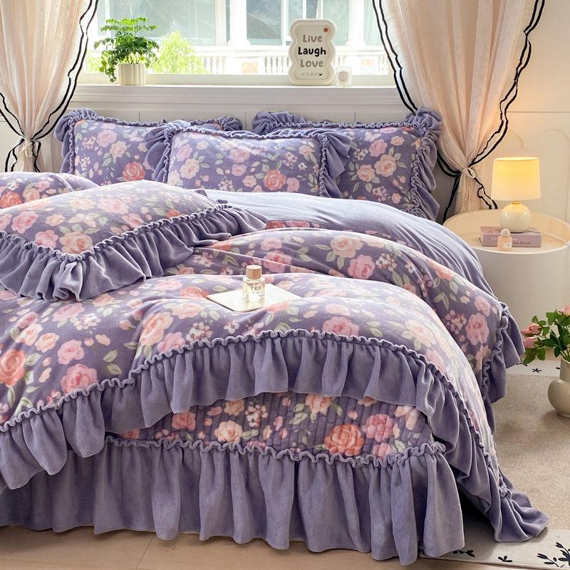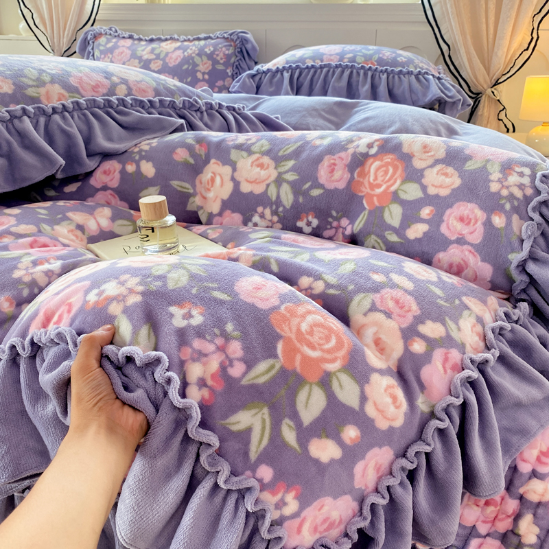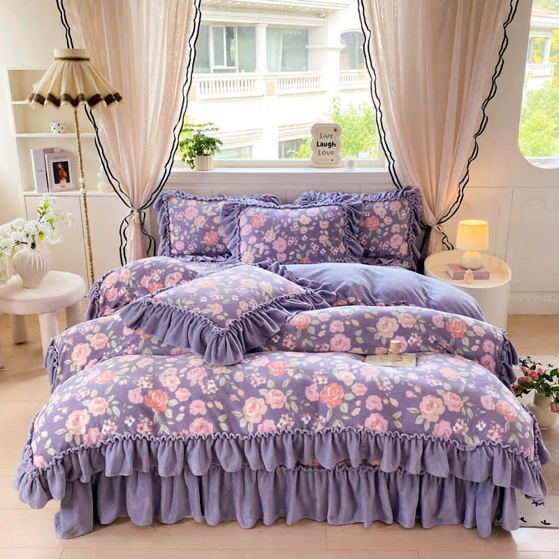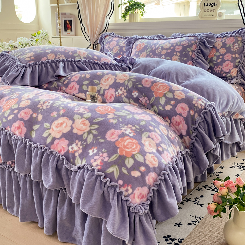 冬季 花边珊瑚绒双面绒被套床裙床罩 牛奶绒加厚绗缝床盖四件套韩版