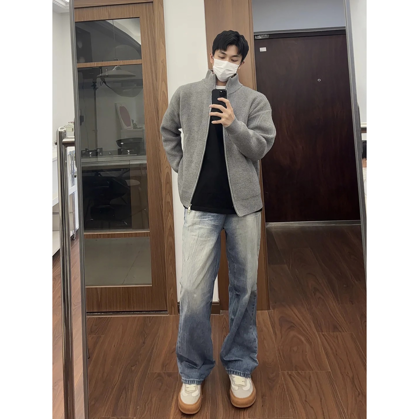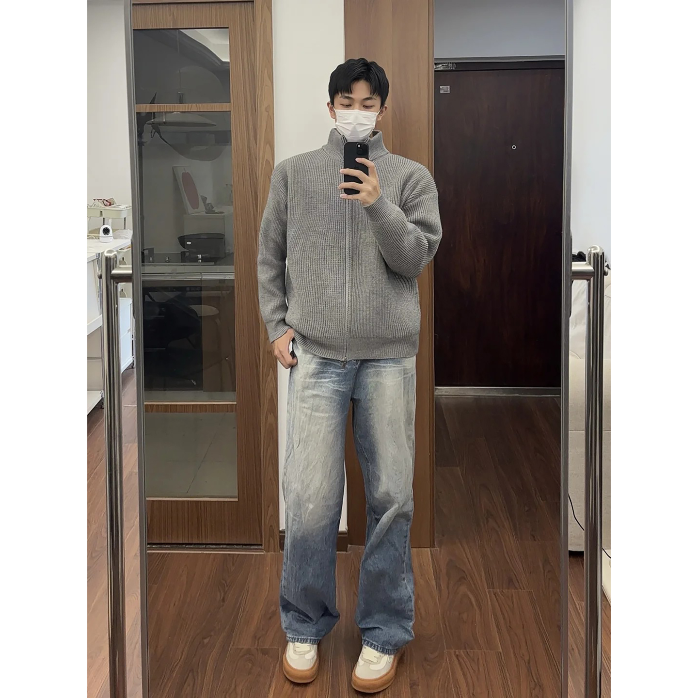线衣外套 韩系慵懒风毛衣开衫 cleanfit灰色高领双拉链针织开衫 男士