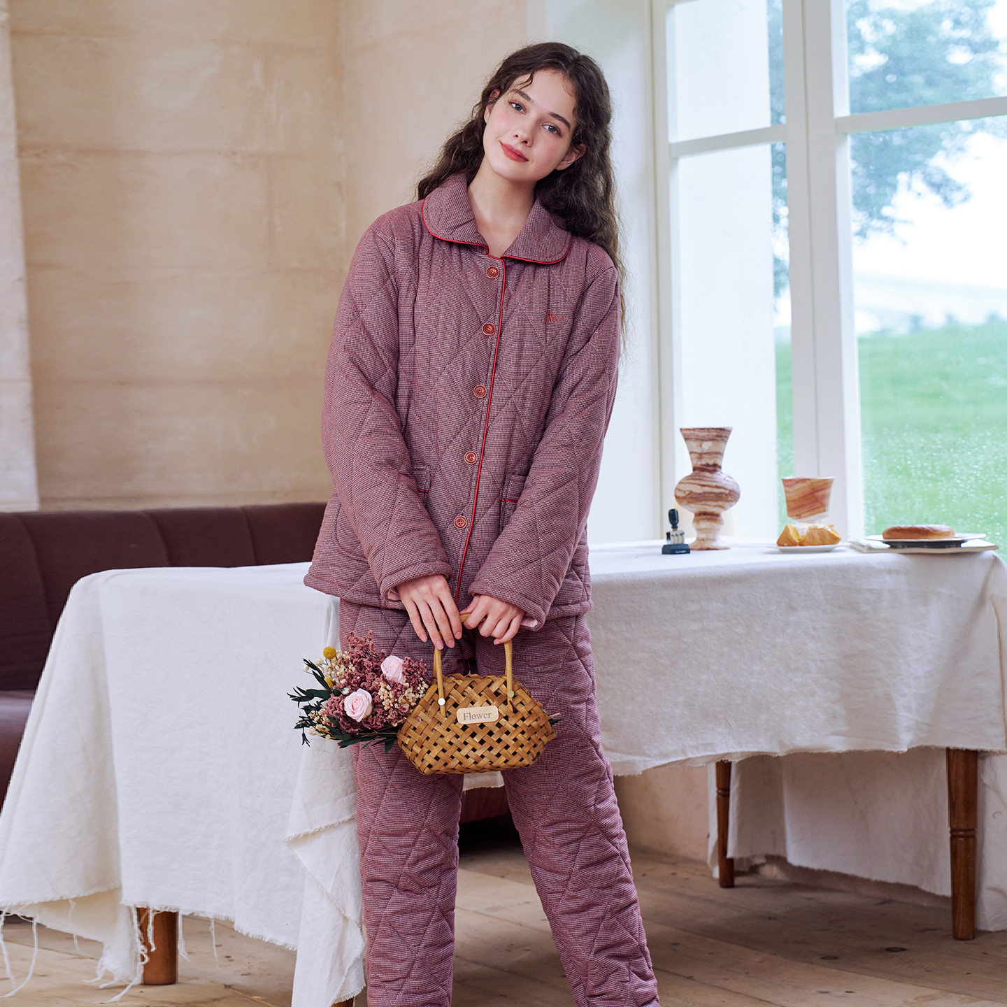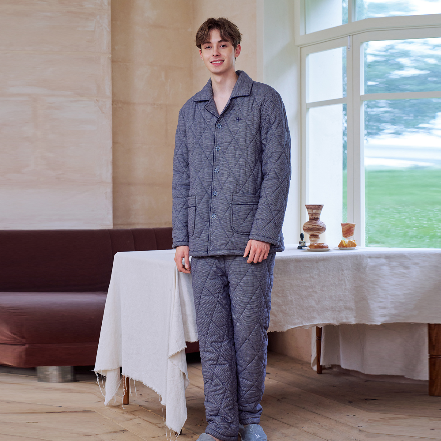 全棉休闲格子家居服 男士 美标新款 三层加厚夹棉纯棉情侣睡衣套装