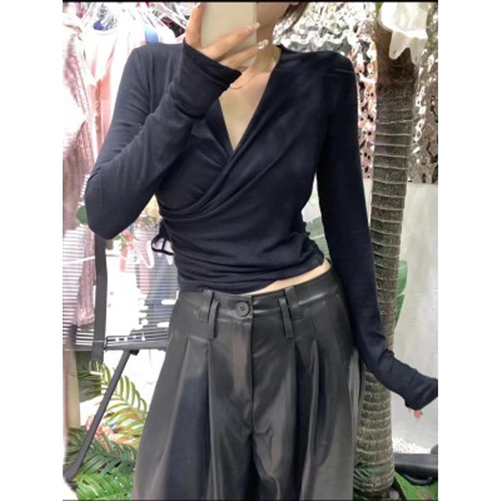 t恤女士2025新款 欲收腰短款 女装 显瘦打底衫 1009u 修身 秋冬V领长袖
