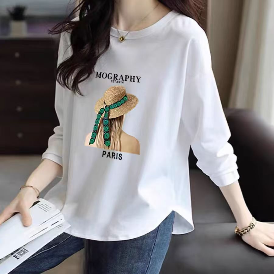 打底衫 纯棉小众弧形长袖 宽松显瘦大码 女士春秋新款 t恤白色中长款