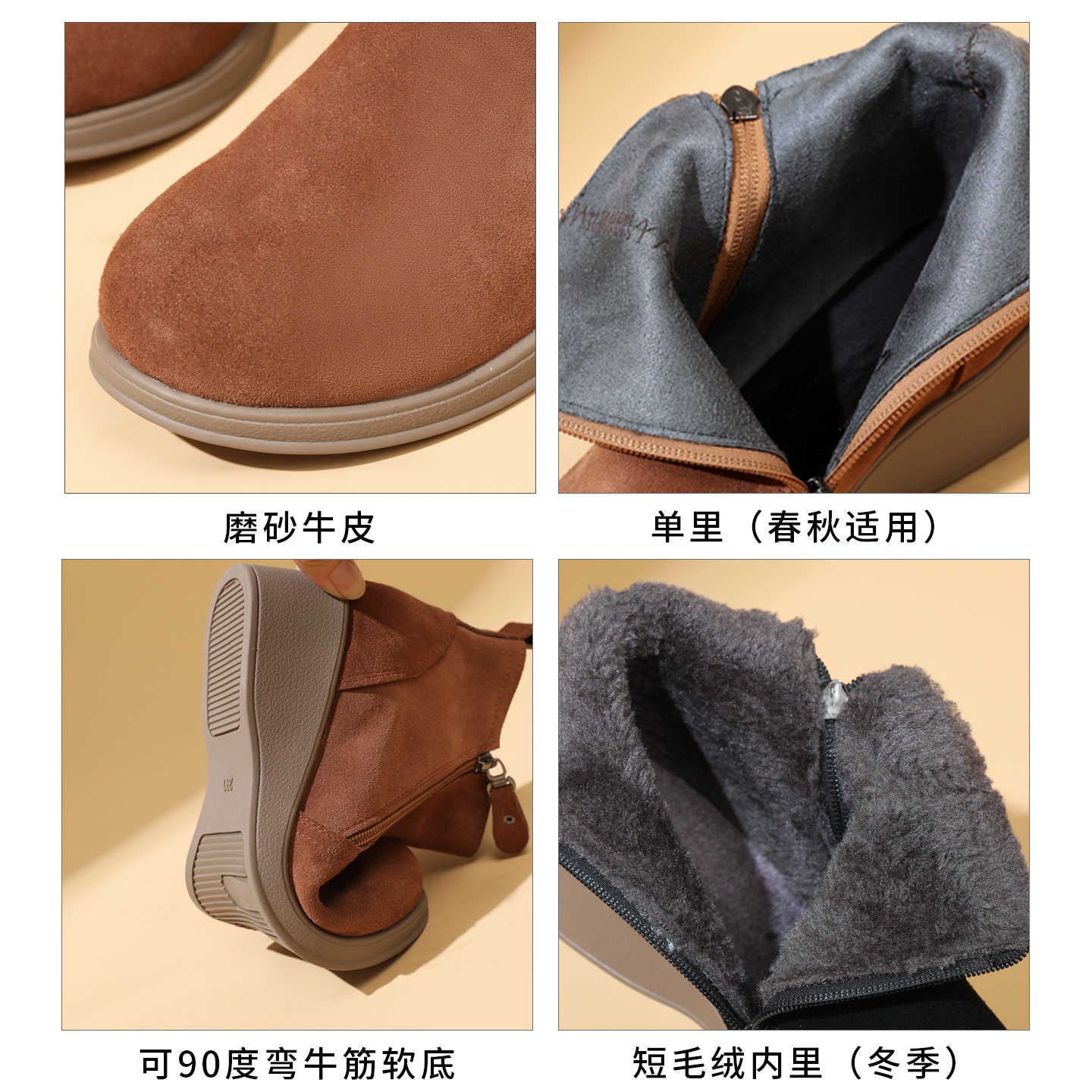 子软底女靴子 防滑女鞋 秋冬季 磨砂真皮坡跟短靴女中跟加绒保暖棉鞋
